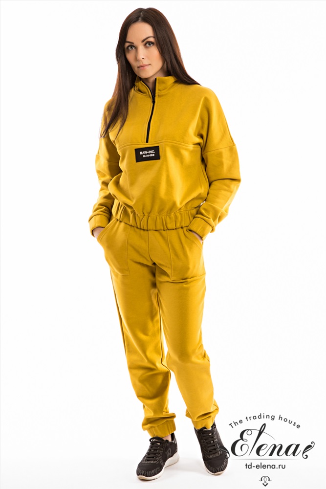 Спортивный костюм выполнен из футер петли (воздушка). Толстовка укороченная, на широкой резине по низу. Воротник-стойка с короткой застёжкой на молнию, рукав спущенный. Спереди расположен декоративный элемент. Брюки с поясом на широкой резине и шнуре, по бокам размещены карманы. Манжеты на рукавах толстовки и внизу брюк на резине.