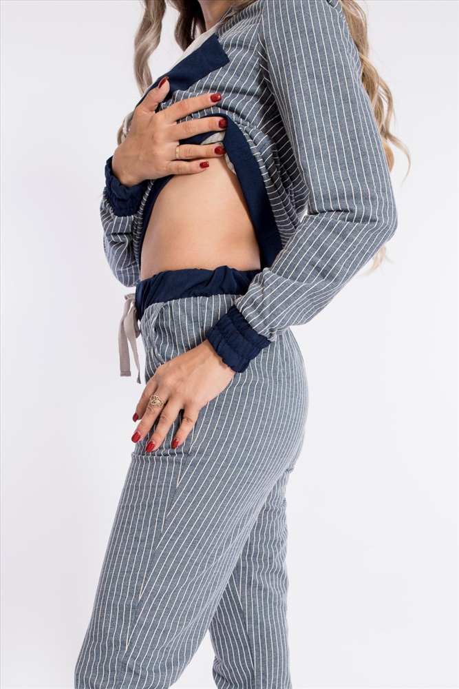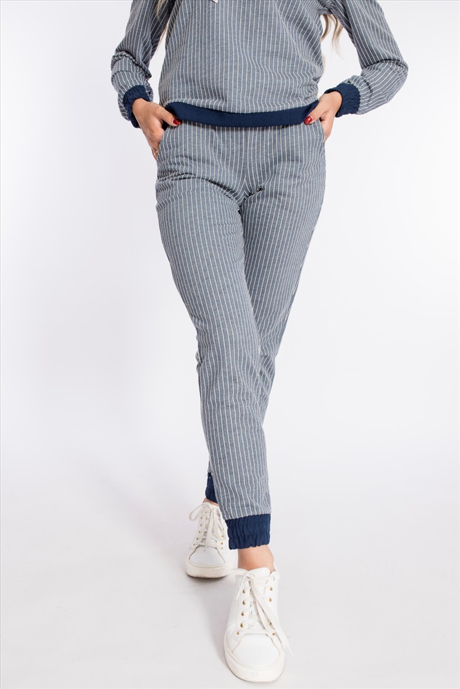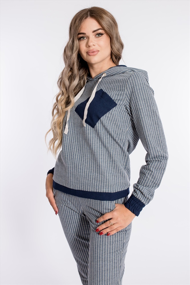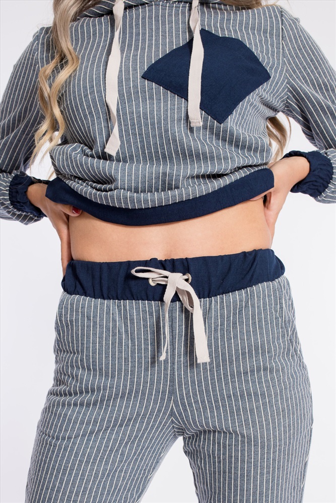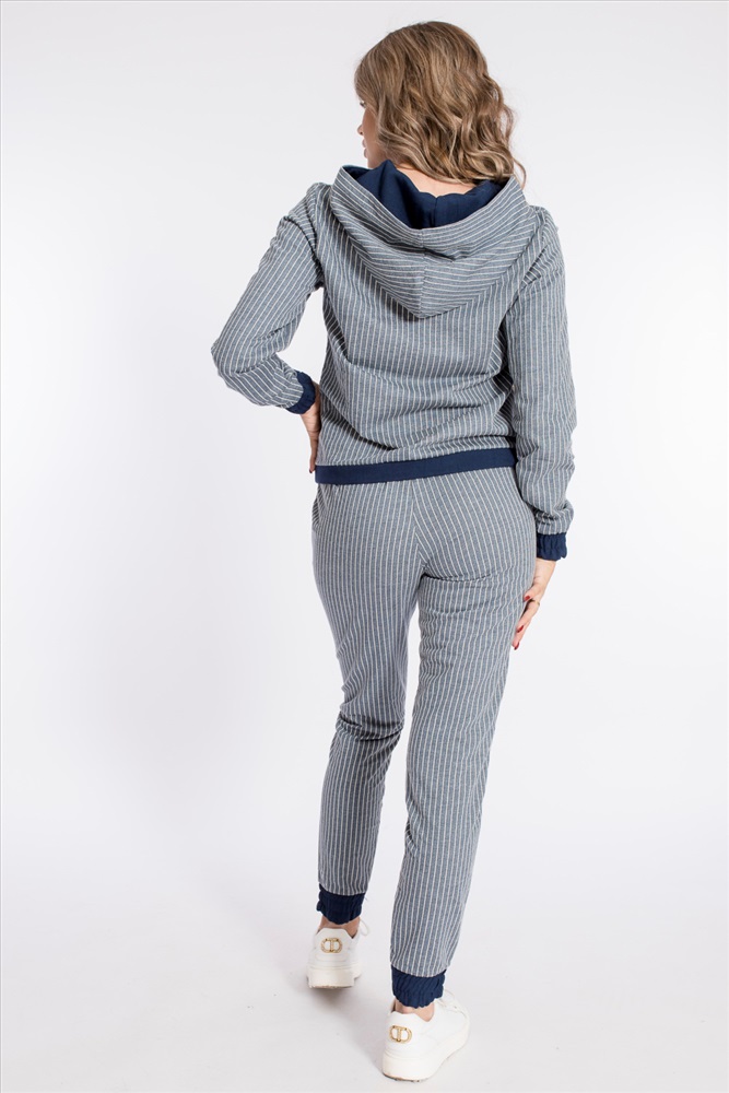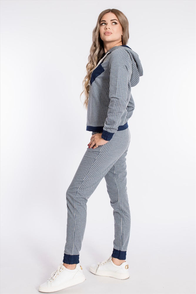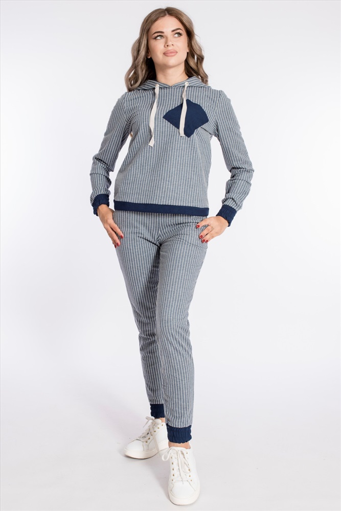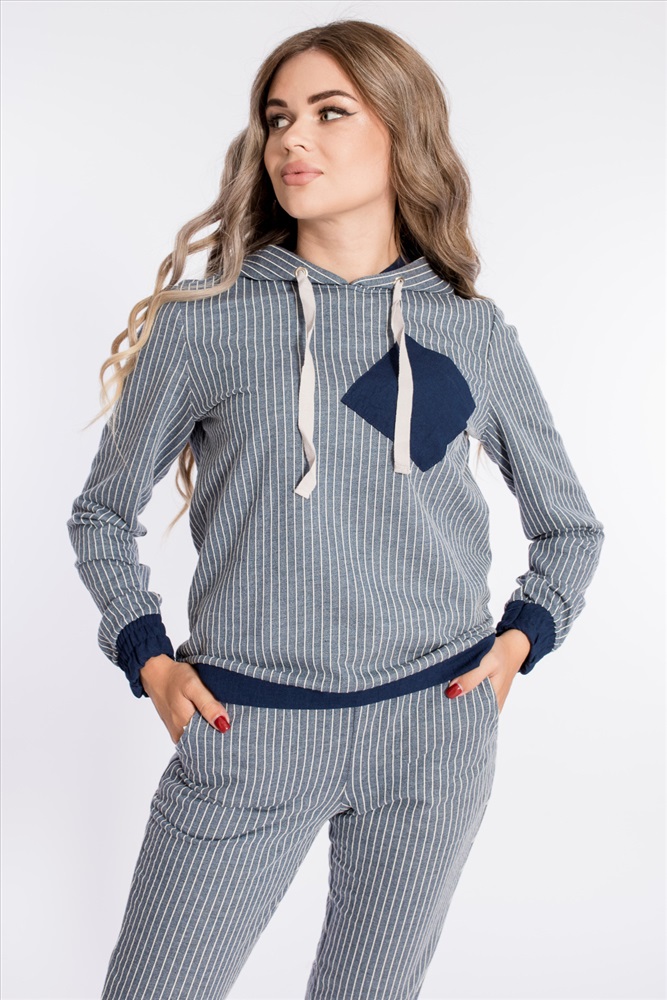 Костюм из футера двухнитки в вертикальную полоску с отделочными деталями изо льна. Толстовка с капюшоном, длинным рукавами на манжетах, с планкой по низу. Спереди расположен нагрудный карман. Ширина капюшона регулируется при помощи шнура. Брюки с боковыми карманами, притачным поясом и манжетами.