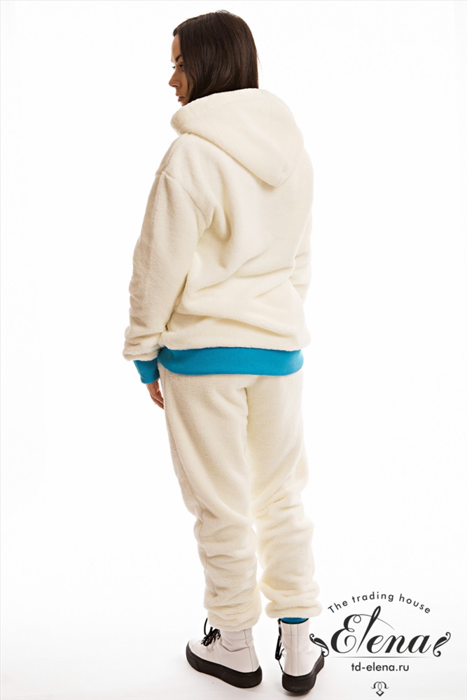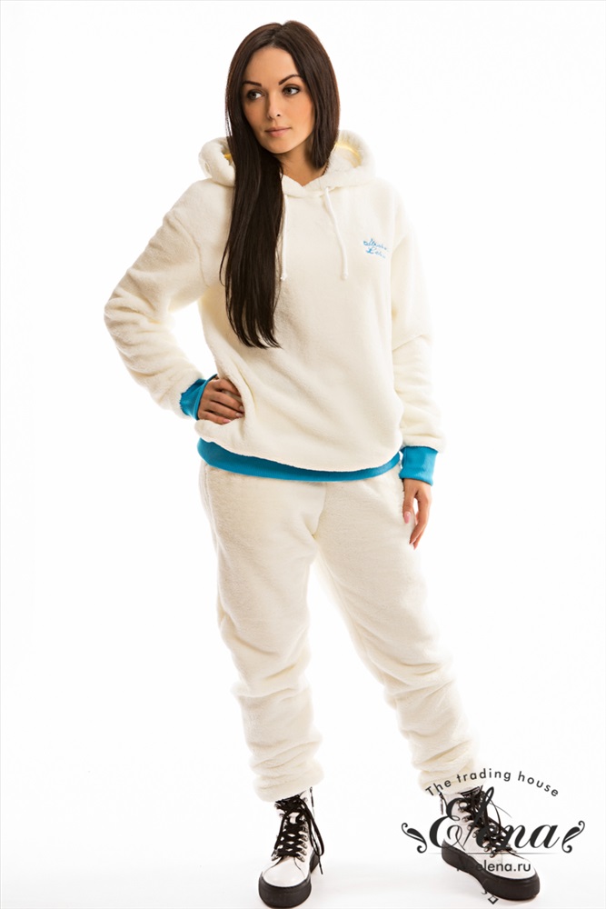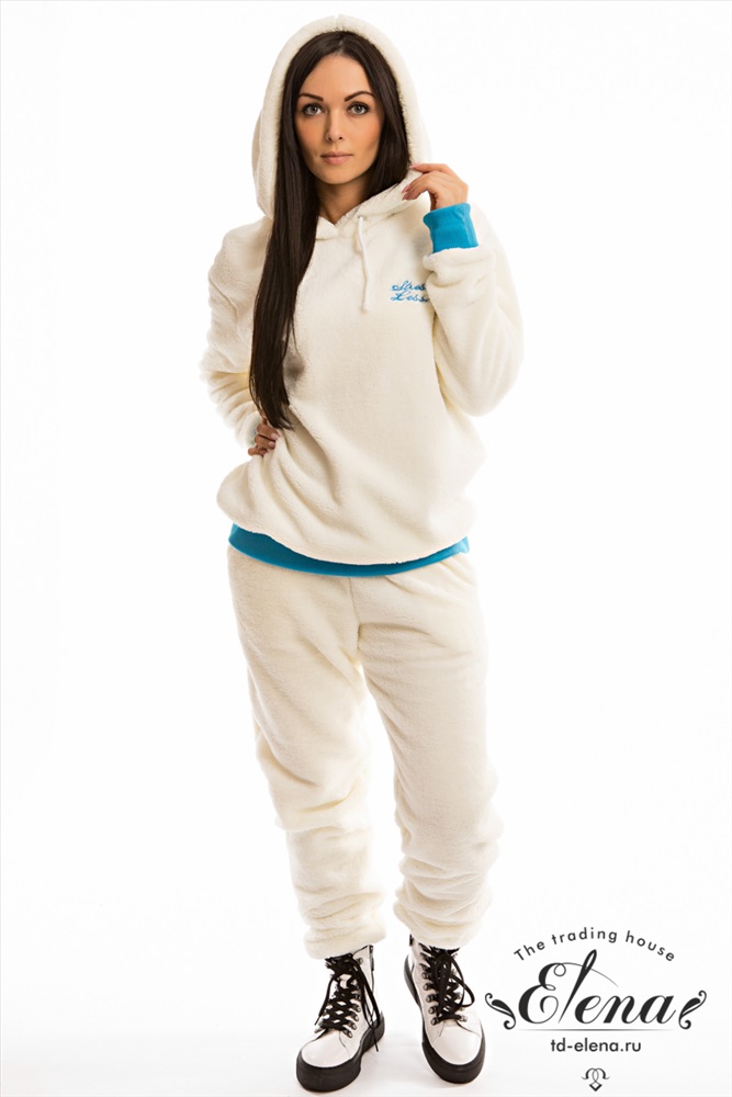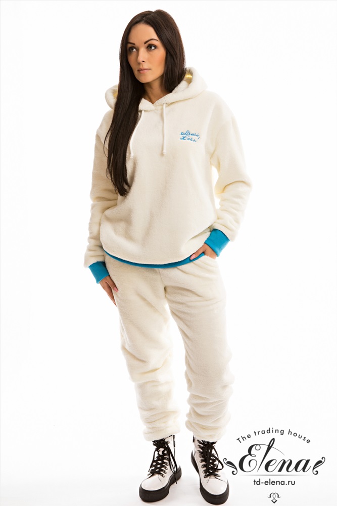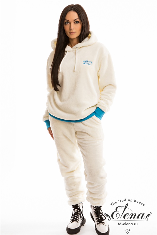 Уютный женский костюм свободной посадки выполнен из велсофта. Толстовка с длинными рукавами, накладным карманом и вышивкой спереди. Ширина капюшона регулируется при помощи шнура. Пояс брюк на резине и шнуре, по бокам размещены карманы. Низ рукавов и брюк на манжетах. Костюм из велсофта - это модный, свежий образ, такой приятный и комфортный к телу.