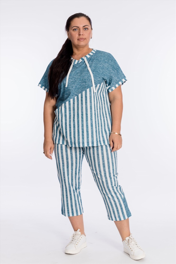 Застежка: Без застежки С капюшоном: Да С карманами: Нет Сезон: Летний Состав: Хлопок 100% Цвет Номенклатуры: разноцветный Костюм выполнен из кулирки, 100% хлопок. Футболка с коротким рукавом, в круглый вырез горловины вставлен шнур. Спереди размещен карман. Капри с поясом на резине. Комментарии к товару
