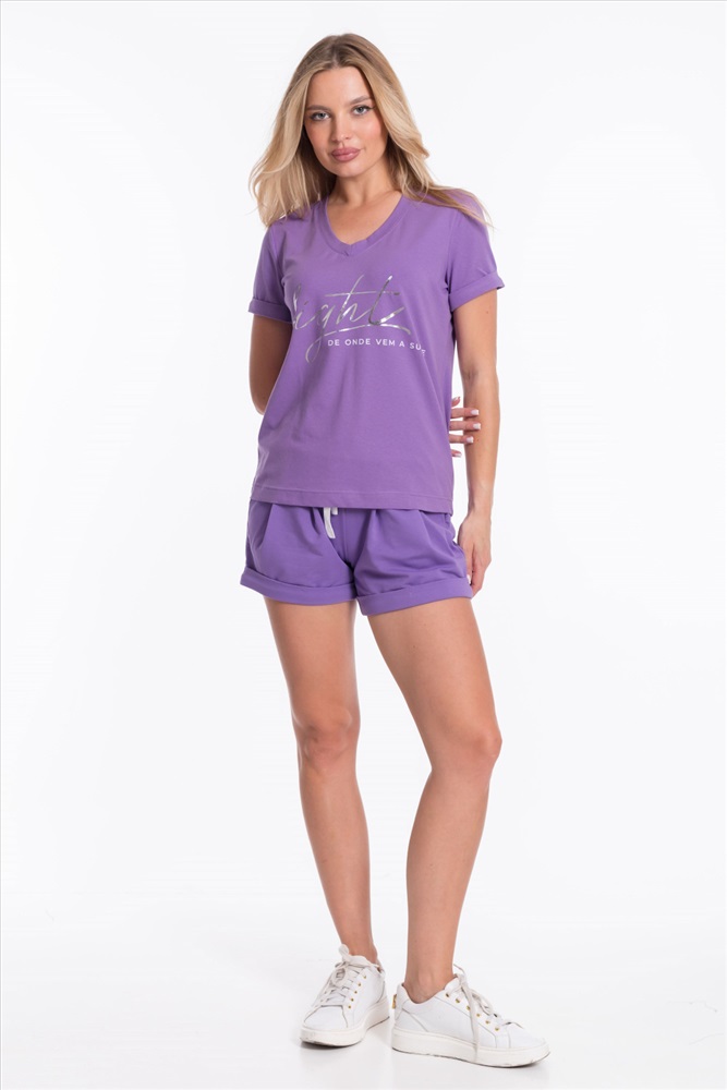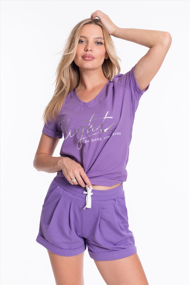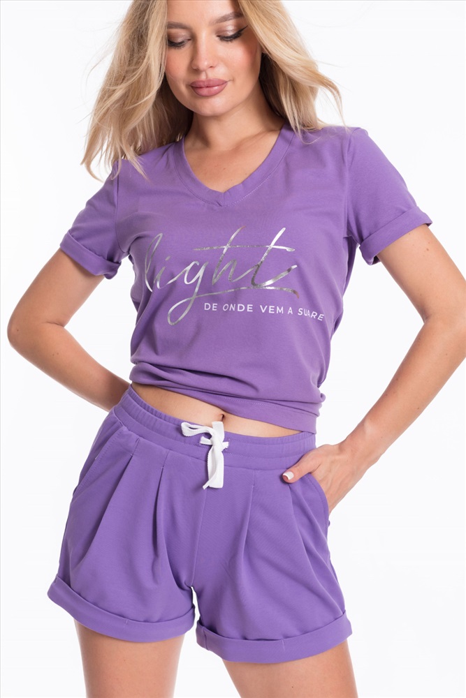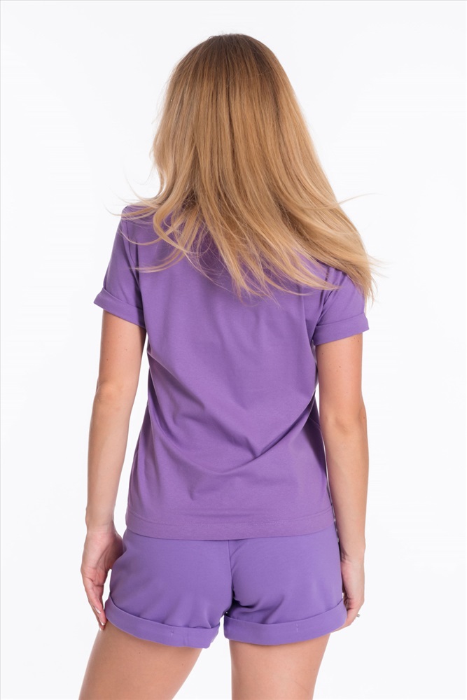 Женский костюм - футболка и шорты, выполнен из комбинации двух видов полотна. Футболка из мягкой и эластичной кулирки с лайкрой обеспечивает свободу движений, а V-образный вырез горловины с планкой придаёт изделию аккуратный вид. Рукава футболки и штанины шорт с отворотами, спереди нанесён интересный принт.