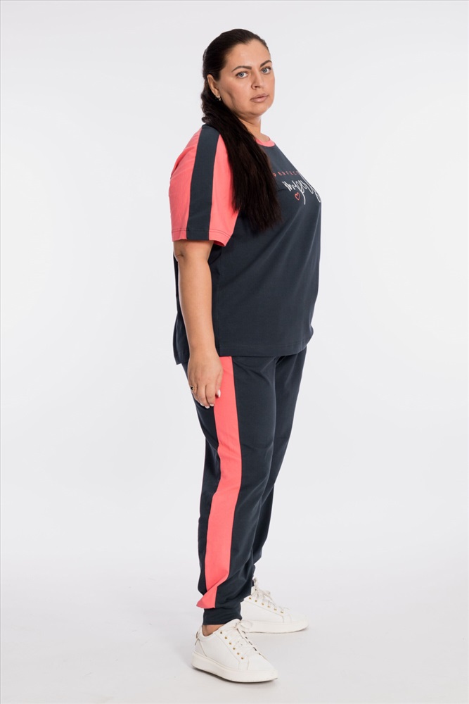 Костюм выполнен из кулирки с добавлением лайкры, состоит из футболки и брюк. Футболка свободного силуэта, с рукавом покроя реглан, круглый вырез горловины оформлен планкой. Спереди нанесён принт. Брюки с отделочными полосами и карманами по бокам, притачным поясом и манжетами внизу.