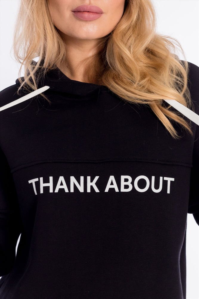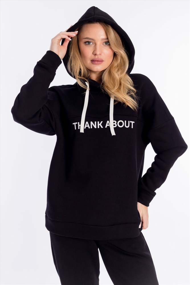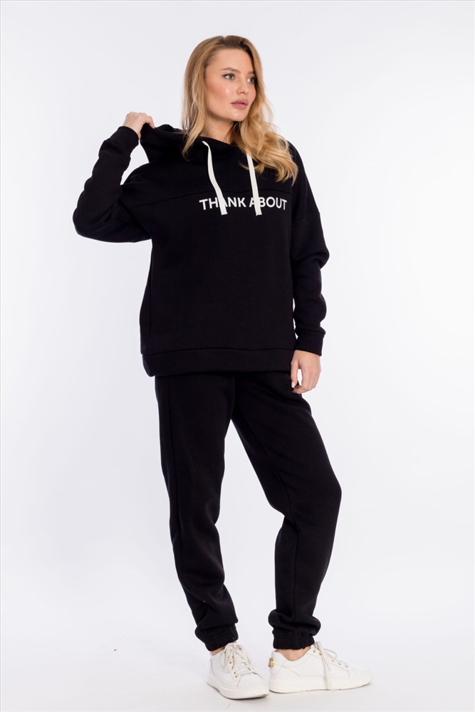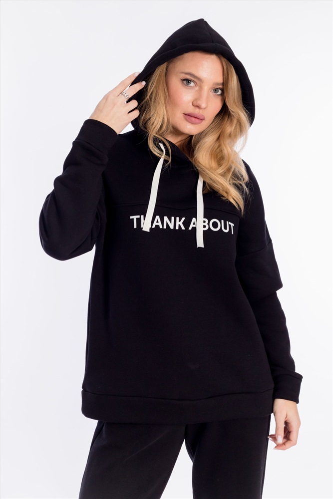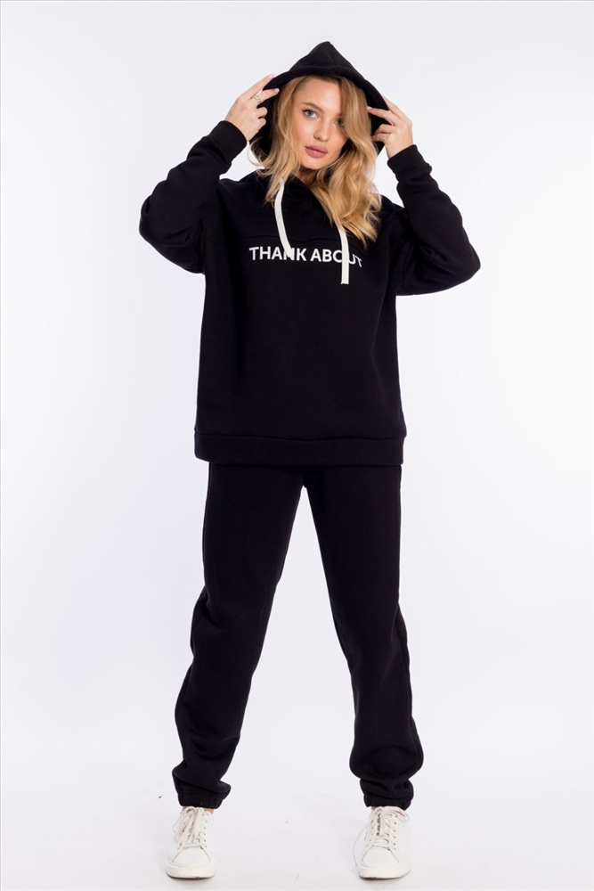 Женский костюм выполнен из однотонного полотна с начёсом. Толстовка удлинённая, cо спущенной линией плеча и капюшоном со шнуром. Спереди на толстовке нанесён принт. Брюки с карманами по бокам, низ на резине. Пояс на резине и шнуре.