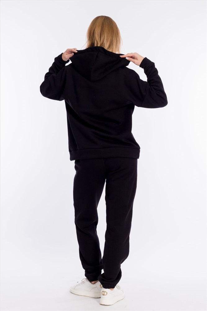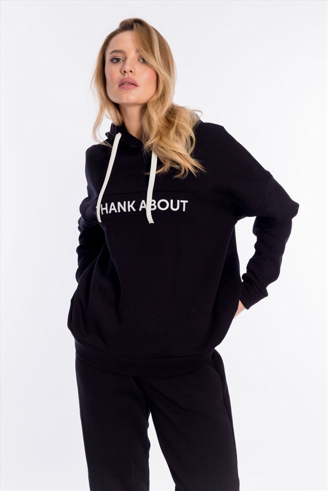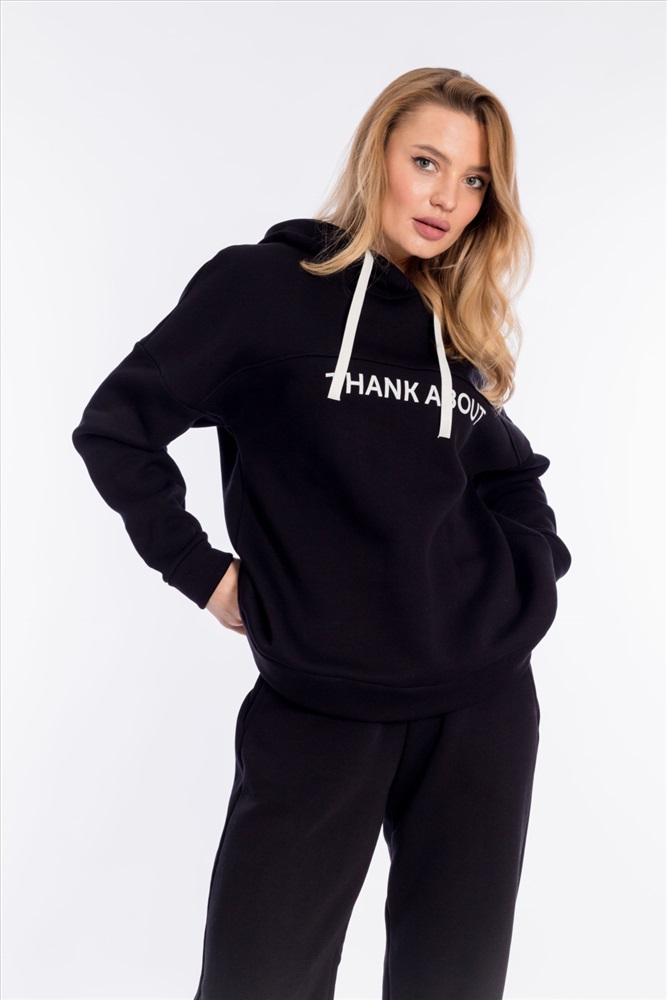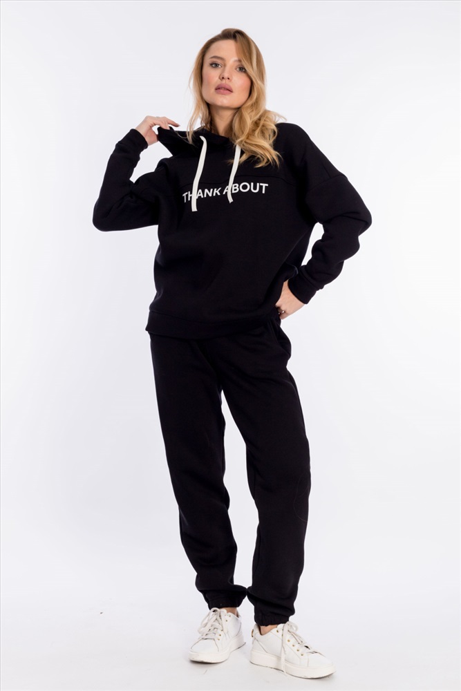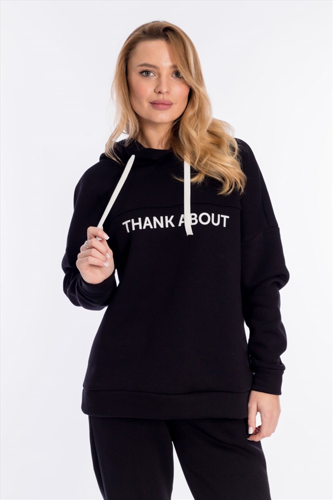 Женский костюм выполнен из однотонного полотна с начёсом. Толстовка удлинённая, cо спущенной линией плеча и капюшоном со шнуром. Спереди на толстовке нанесён принт. Брюки с карманами по бокам, низ на резине. Пояс на резине и шнуре.
