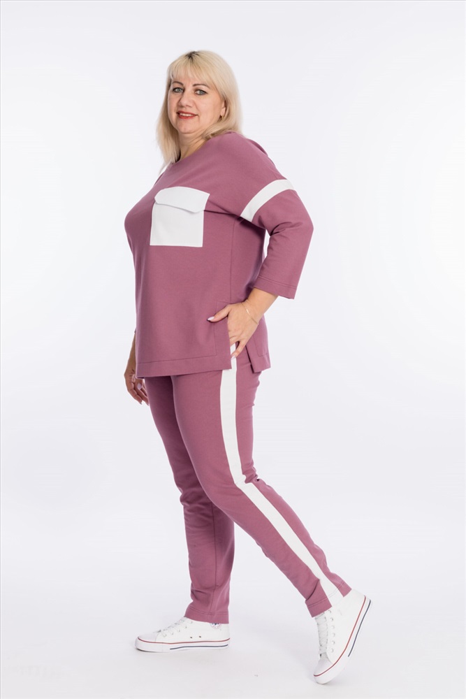 Костюм из однотонного футера с лайкрой состоит из брюк и толстовки. Брюки с боковыми карманами, притачным поясом и отделочной полосой сбоку. Толстовка со спущенной линией плеча и с рукавами длиной 3/4 и накладным карманом с клапаном. Карман и полосы на рукавах из отделочного полотна. Внизу, по бокам на толстовке декоративные разрезы.
