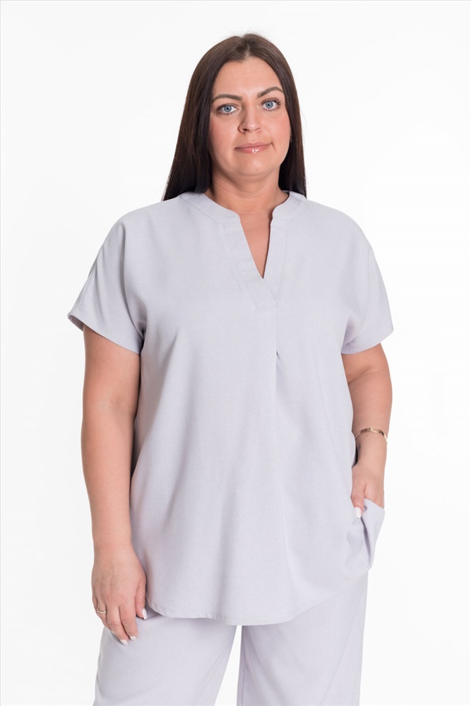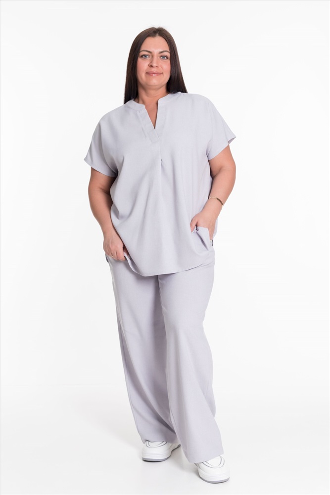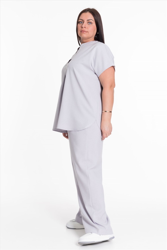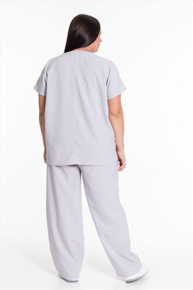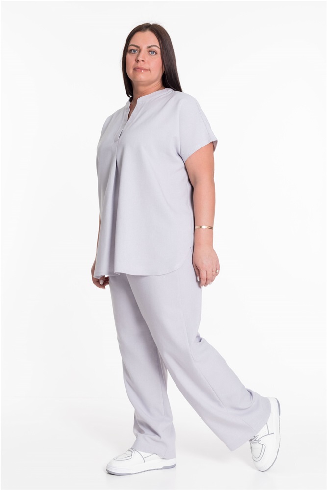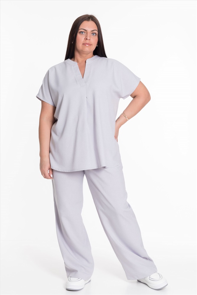 Застежка: Без застежки С капюшоном: Нет С карманами: Нет Сезон: Летний Состав: Полиэстер 100% Цвет Номенклатуры: серый Женский костюм — отличный выбор для повседневной носки. Он выполнен из практичного и лёгкого полотна, имитирующего лён. Футболка свободного кроя с коротким цельнокроеным рукавом. V-образный вырез горловины оформлен планкой и придаёт изделию стильный вид. Брюки широкие с поясом на резинке обеспечивают комфортную посадку и не сковывают движения. Наличие карманов делает модель более функциональной. Такой костюм идеально подойдёт для прогулок, неформальных встреч или отдыха. Он выполнен из качественного материала, который хорошо пропускает воздух и обеспечивает комфорт при движении, а также не требует особого ухода. Комментарии к товару