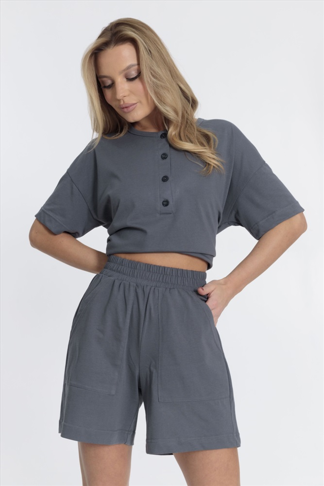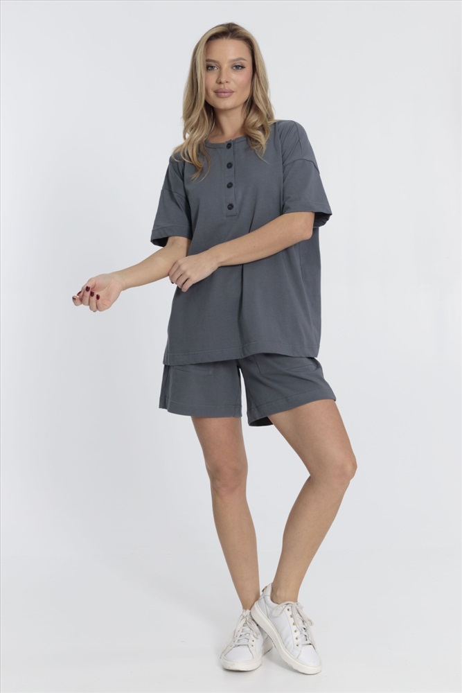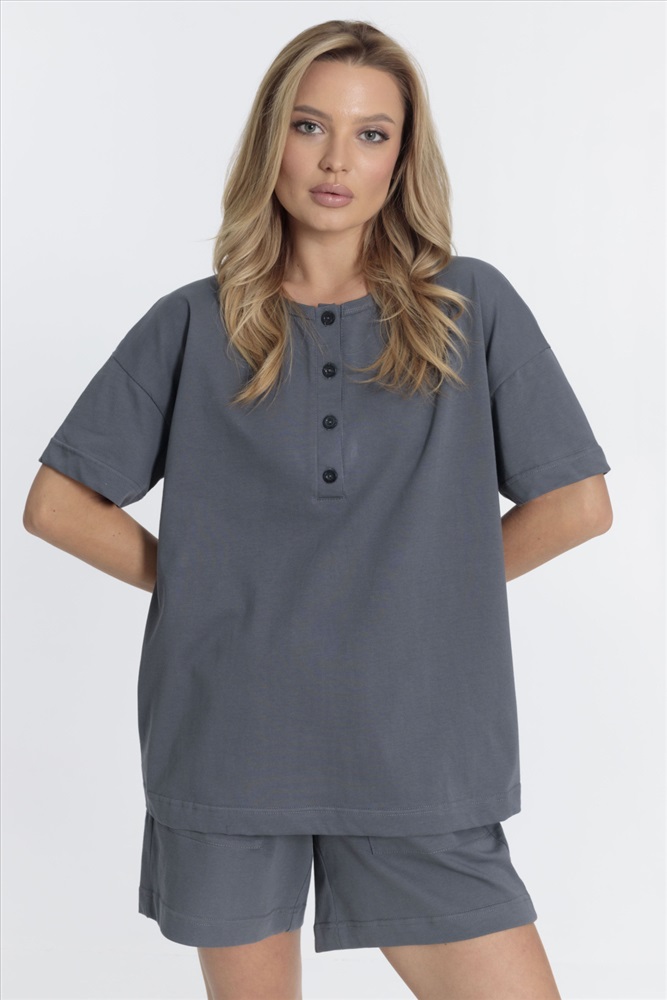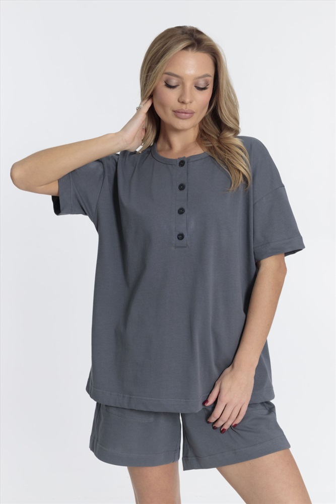 Футболка - свободный крой, спущенный рукав, круглый вырез горловины декорирован пуговицами