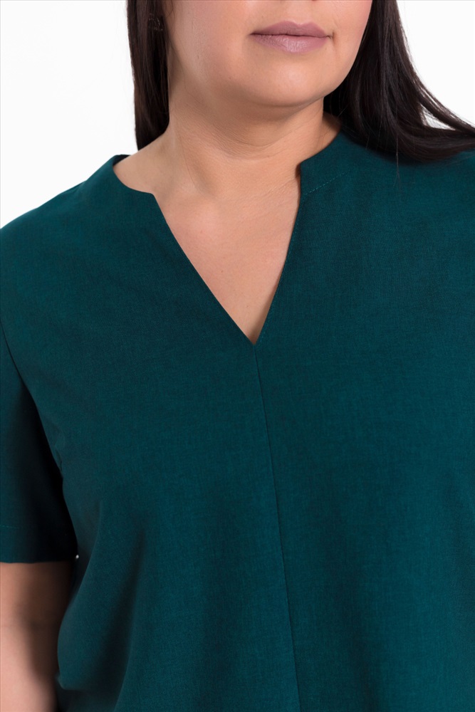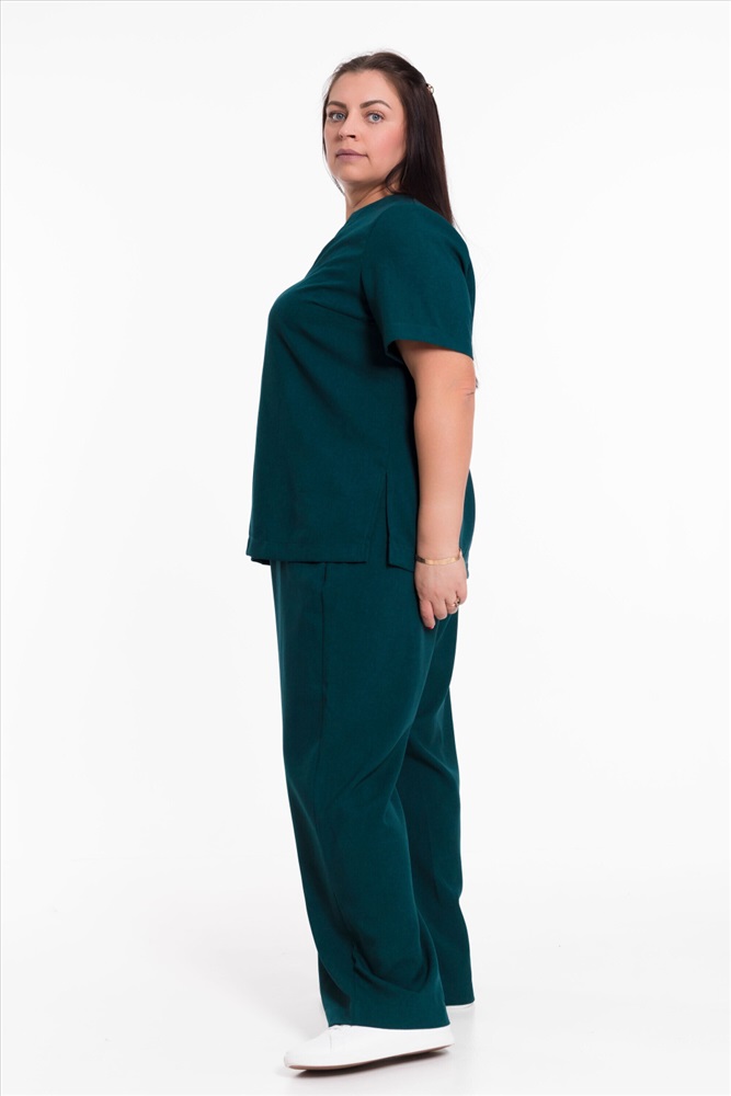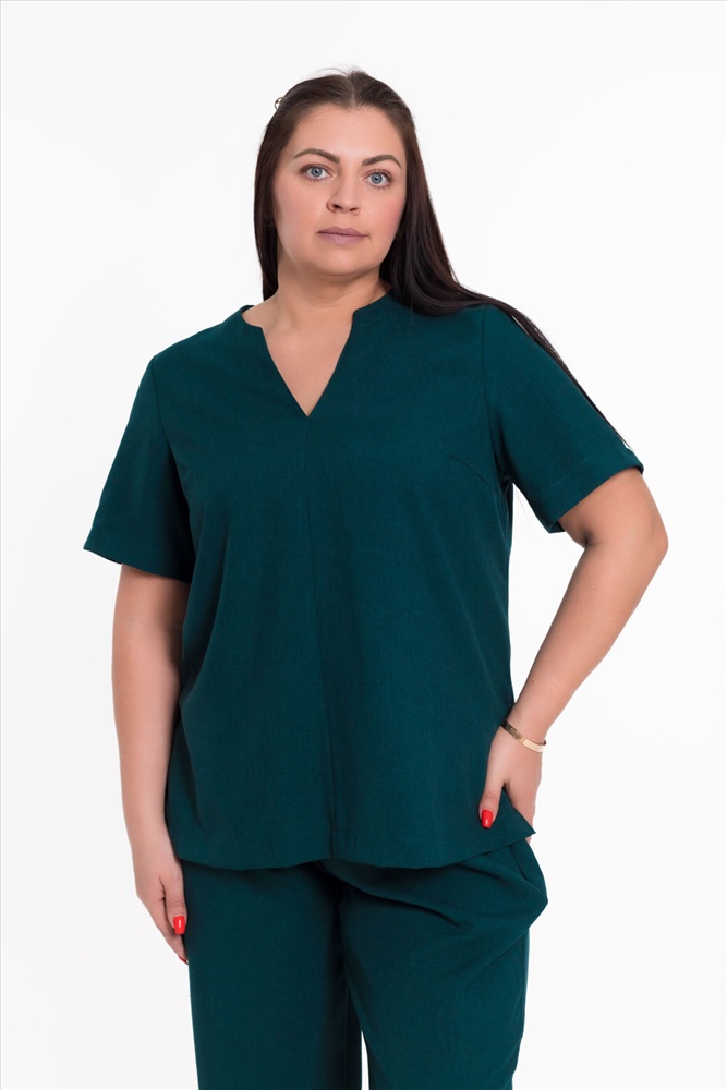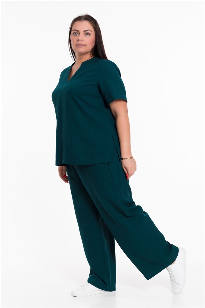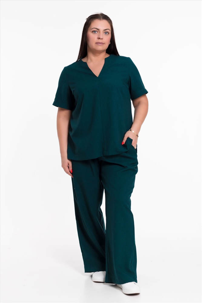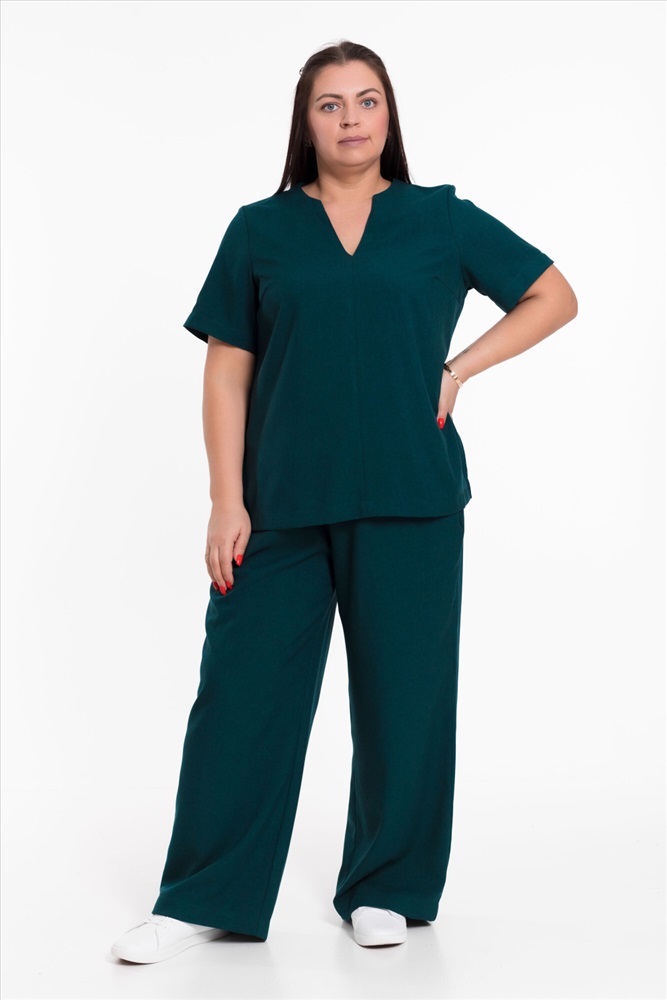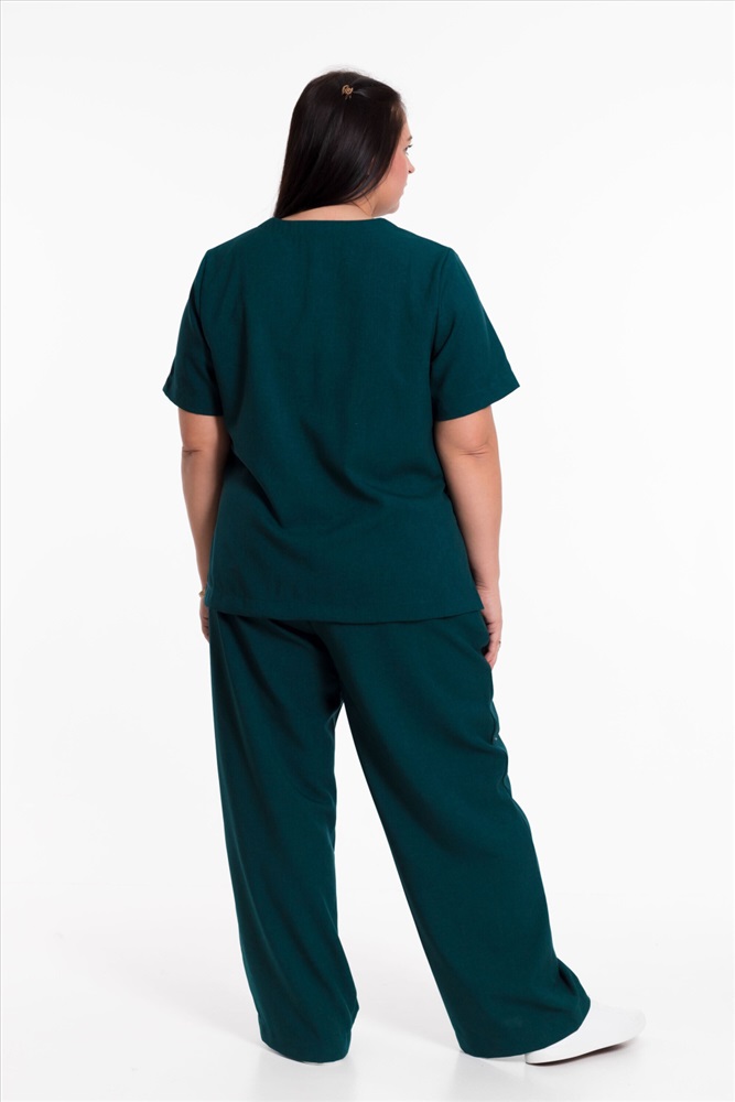 Женский костюм — отличный выбор для повседневной носки. Он выполнен из практичного и лёгкого однотонного полотна зеленого цвета, имитирующего лён.