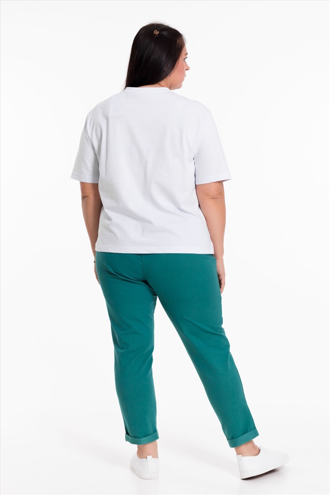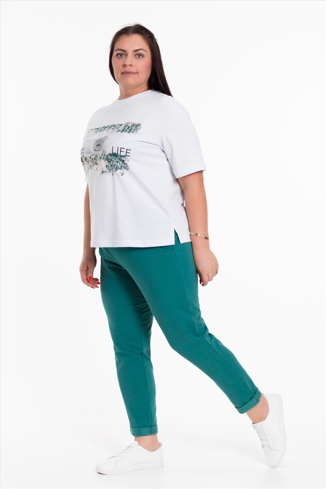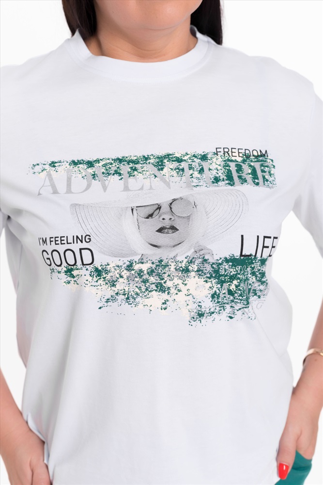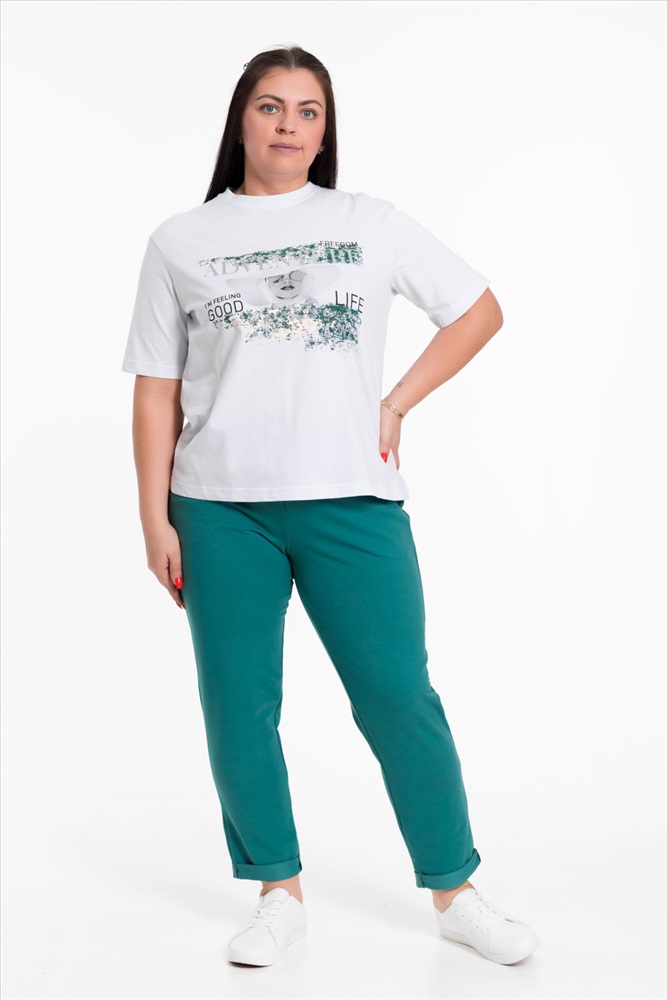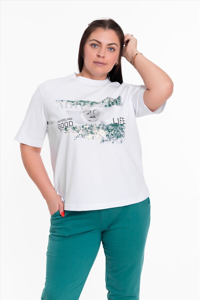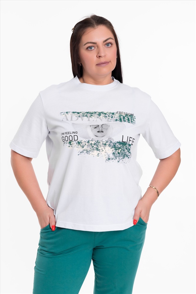 Футболка белого цвета имеет спущенную линию плеча, что придаёт модели свободный и расслабленный вид. Рукав доходит до локтя, обеспечивая удобство и свободу движений. По бокам внизу расположены небольшие разрезы, а спереди — принт, который гармонирует с цветом брюк.