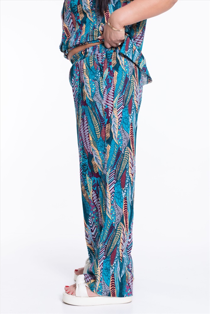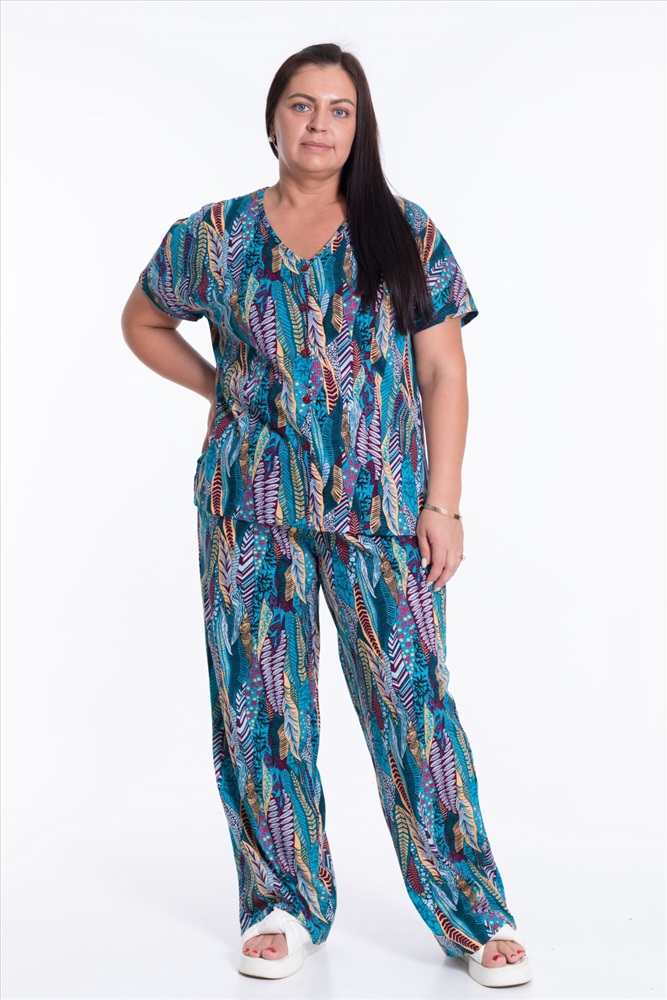 Костюм женский из кулирки. Брюки прямые свободные с боковыми карманами и притачным поясом на резинке. Блузон со спущенным рукавом, V-образным вырезом горловины и имитацией застежки.