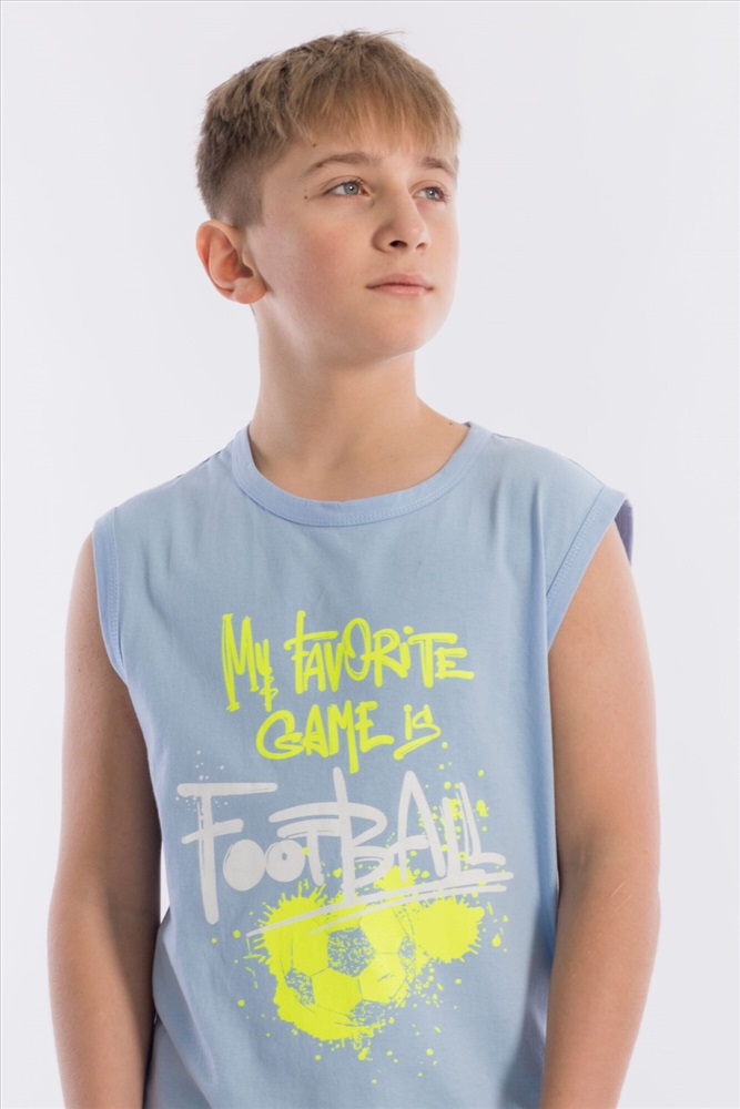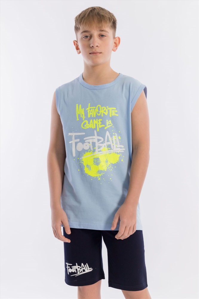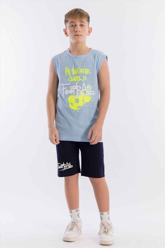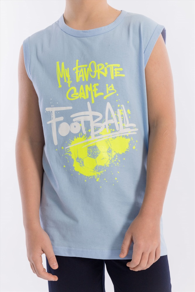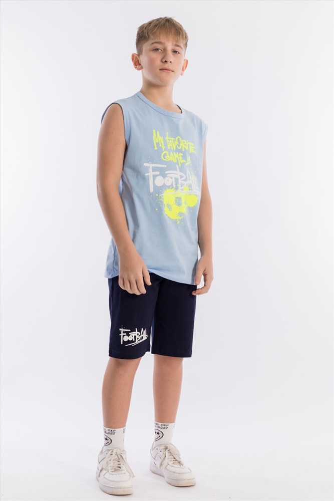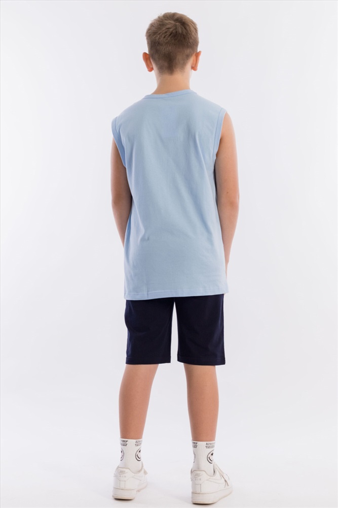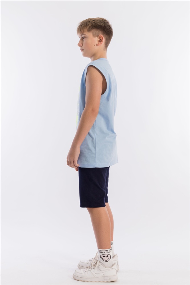 Состав: Хлопок 100% Костюм для мальчика из кулирки. Майка однотонная, с принтом спереди, проймы и горловина обработаны бейкой. Шорты с поясом на резинке и принтом. Размерный ряд: 34-42. Комментарии к товару