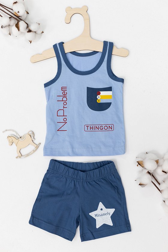 Костюм выполнен из хлопкового полотна. Состоит из шорт и майки. Спереди на майке нанесён принт. Шорты с поясом на резине и принтом.