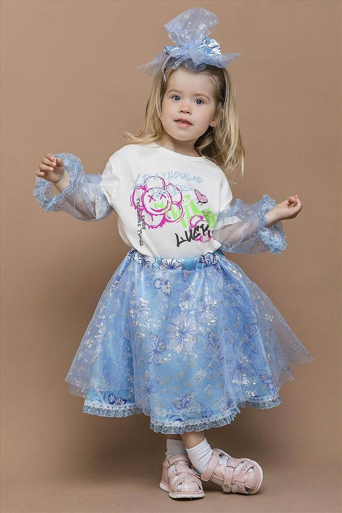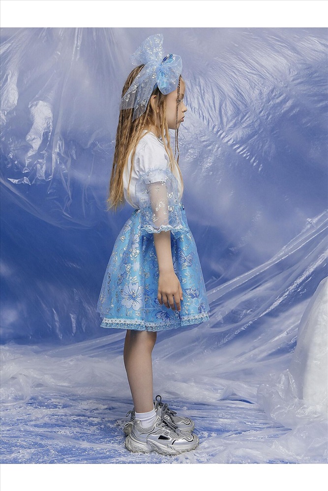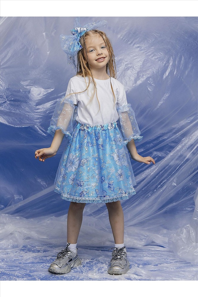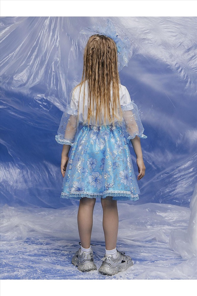 Карнавальный костюм Мальвина – волшебный образ из любимой сказки. В комплект входит: пышная юбка, съемные рукава на резинках – удобно регулируются и дополняют наряд,а также декоративный ободок с бантом. Съемные элементы позволяют адаптировать наряд под любые условия. Нежное сочетание голубого и белого цвета и цветочных узоров с блестками.