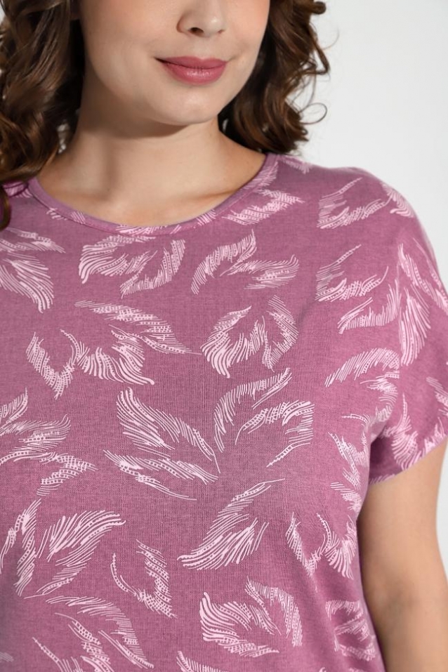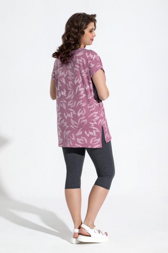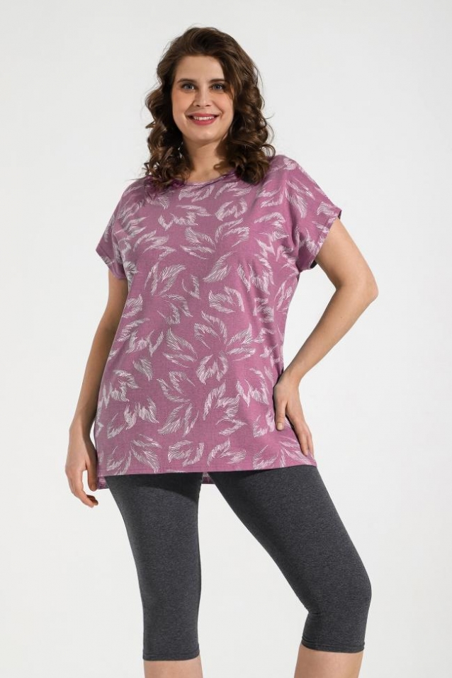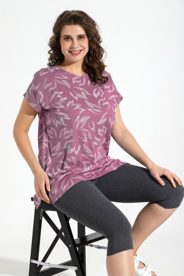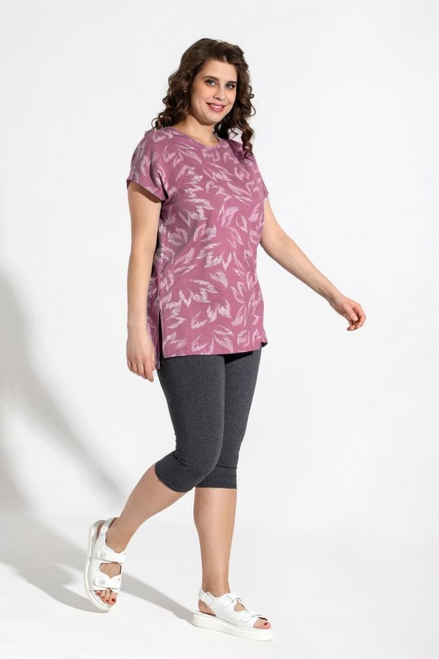 Костюм из трикотажного полотна «кулирка» в комбинации двух видов: гладкокрашеного «меланжированого» и с набивным рисунком, состоящий из футболки и бридж.Футболка – из полотна с набивным рисунком, с короткими цельнокроеными рукавами, горловиной овальной формы, окантованной основным материалом и разрезами по боковым швам. Бриджи-велосипедки – из «меланжированого» полотна, классического покроя, с эластичной тесьмой по талии.