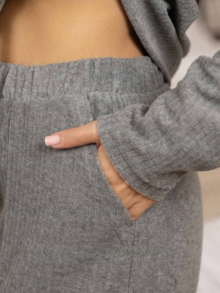 Домашний махровый костюм, идеальный выбор для прохладной погоды. Толстовка свободного силуэта с капюшоном и длинным рукавом, брюки прямого кроя с карманами в боковых швах.
