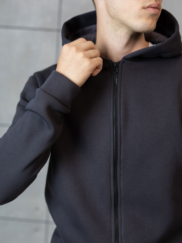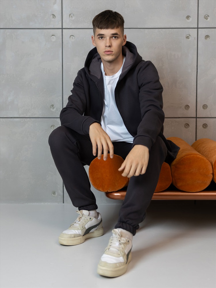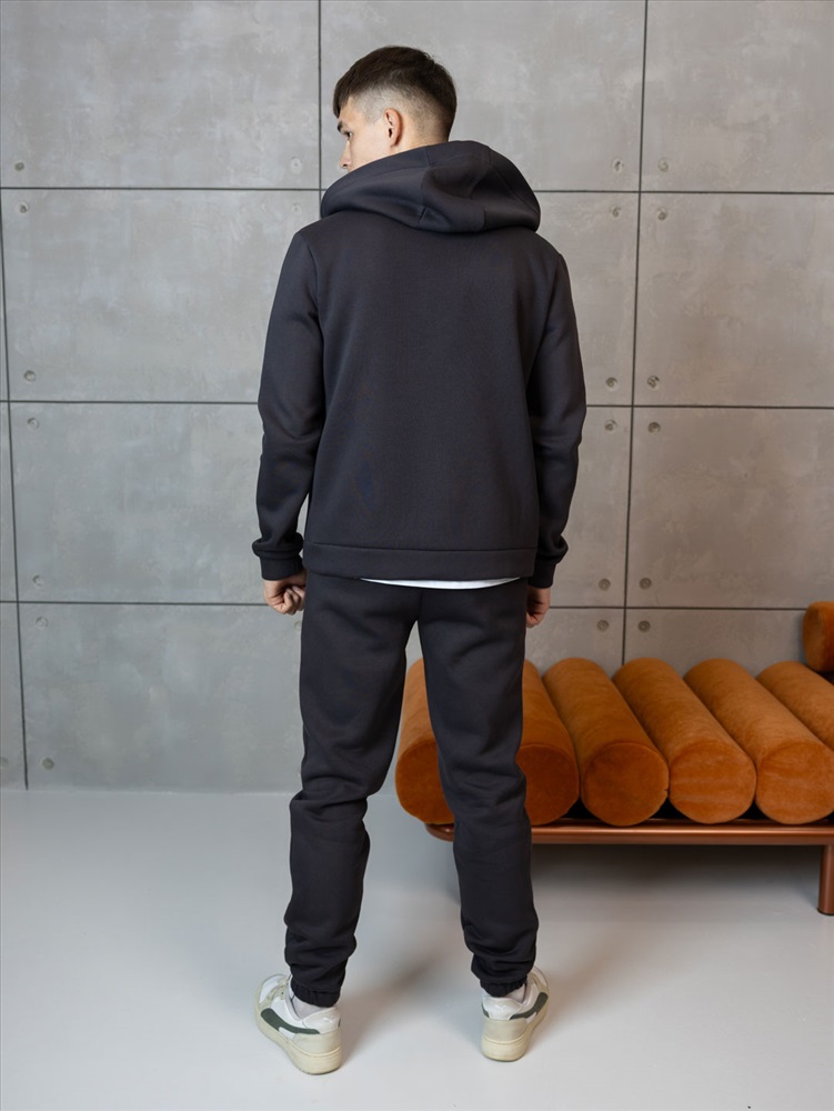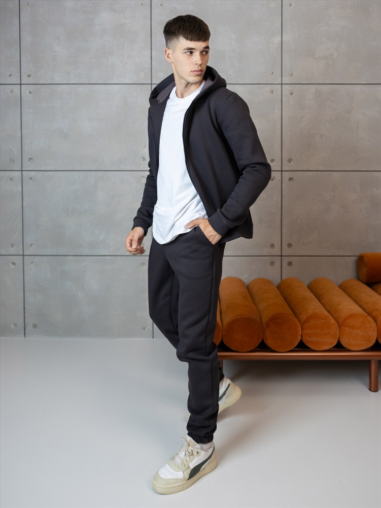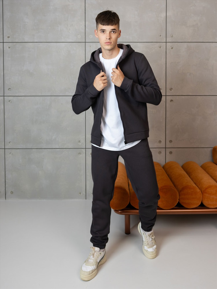 Костюм мужской утепленный, состоящий из худи с капюшоном и брюк. Толстовка средней длины, с застежкой на молнию и рукавом на манжетах. Брюки с поясом на резинке и карманами с отрезным бочком. Низ брючин на манжетах. Мягкий и удобный вариант, для прогулок или на каждый день. Отличный вариант для демисезона.