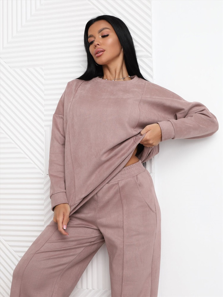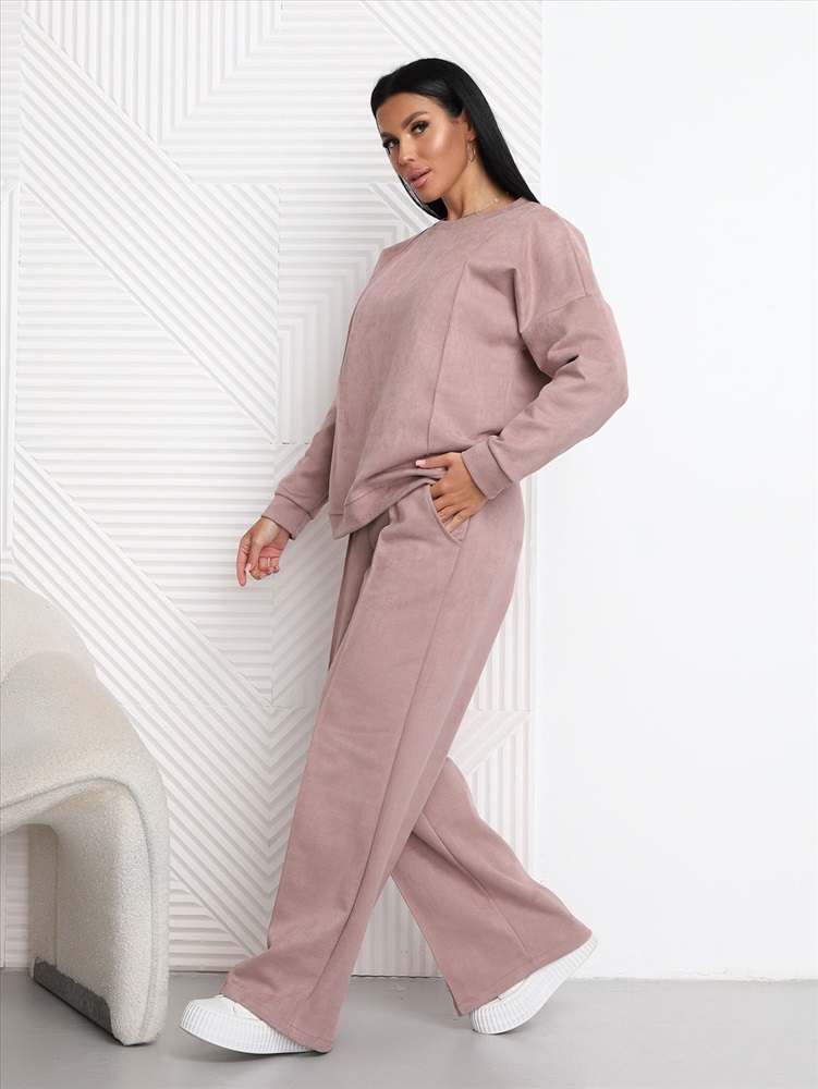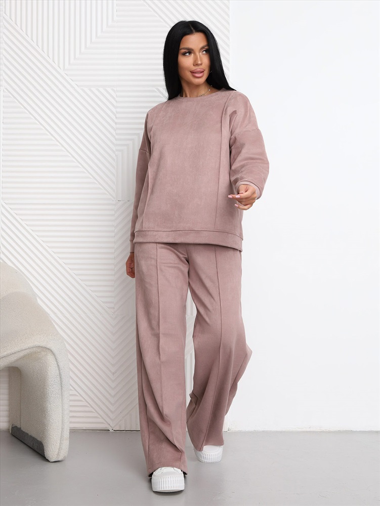 Артикул: НФ-00245761 Особенности модели: Палаццо со стрелками Бренд: Текс-плюс Состав материала: 95% Полиэстер / 5% Эластан Цвет: Какао Материал: Замша Для: Женщин Вид изделия: Костюмы с брюками Комплектация: Брюки - 1 шт., Кофта - 1 шт. Код товара: НФ-00245761 Брючный замшевый костюм из качественного приятного на ощупь полотна. Толстовка выполнена в стиле спорт шик со спущенным плечом, О-образной горловиной, стрелками на полочке и манженой по низу изделия и рукаву. Брюки прямого кроя, со стрелками и карманами в боковых швах, полной длины. Комментарии к товару