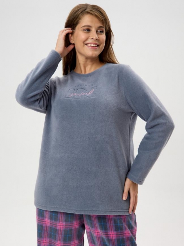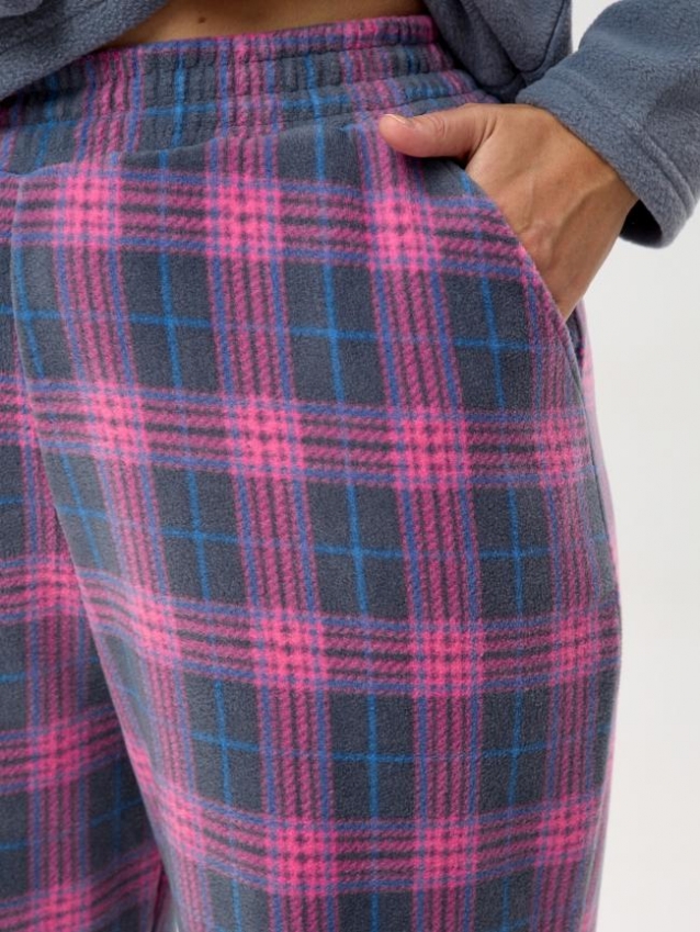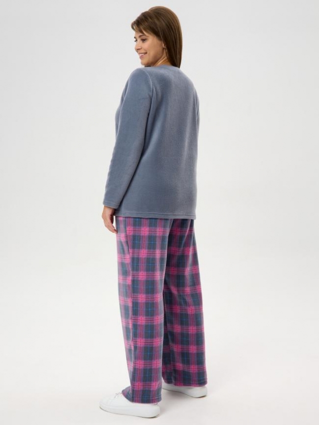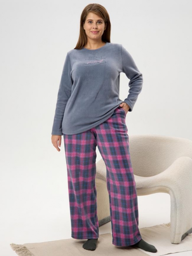Костюм женский из трикотажного полотна «флис» в комбинации двух видов: с набивным рисунком «клетка» и гладкокрашеного в единой цветовой гамме, состоящий из джемпера и брюк.Джемпер - из гладкокрашенного полотна, классического покроя, с длинными втачными рукавами, горловиной овальной формы, обработанной втачной планкой и вышивкой в центре полочки.Брюки – из полотна с рисунком в клетку, длинные, свободные, на поясе с эластичной тесьмой внутри и карманами в боковых швах. Комментарии к товару