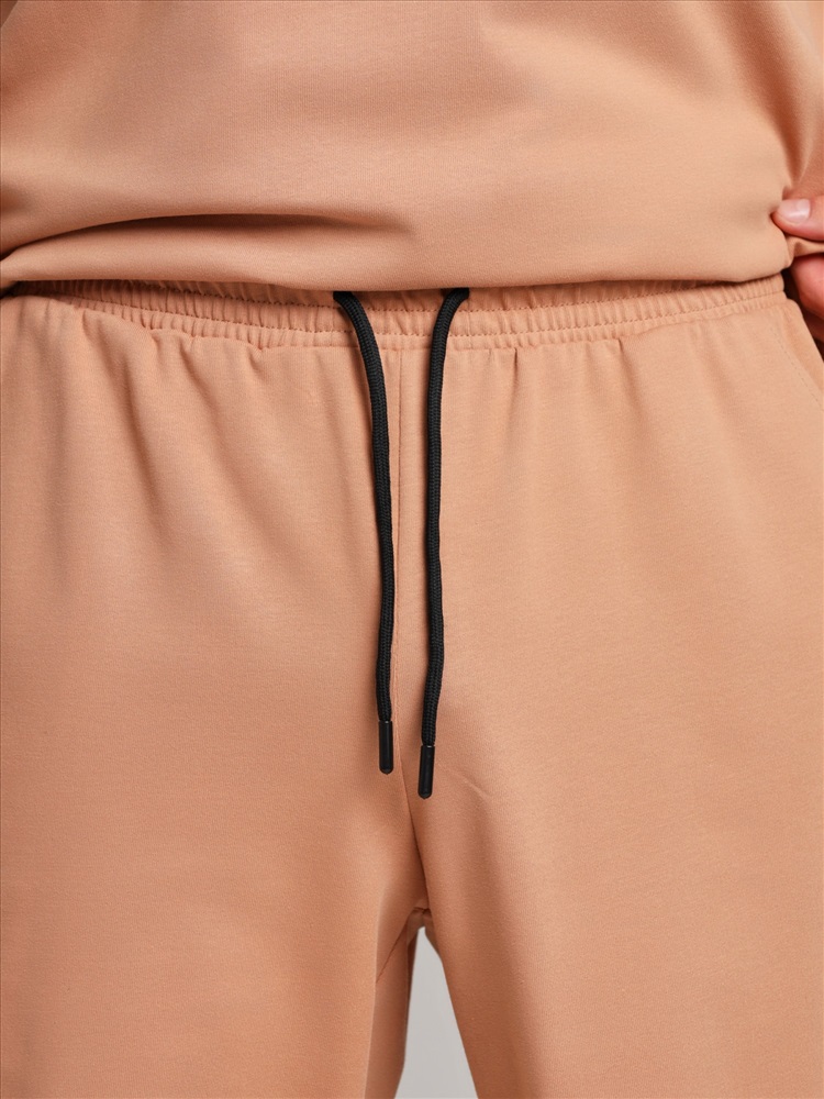 Костюм мужской из плотного гладкокрашеного трикотажного полотна "кулирка", состоящий из футболки и шорт. Футболка - свободного покроя, с удлиненными плечевым и швами, короткими втачными рукавами и горловиной овальной формы, обработанной втачной планкой. В нижней части переда слева настрочен декоративный элемент прямоугольной формы. По горловине проложена отделочная строчка. Шорты - классического покроя, на притачном поясе с эластичной тесьмой внутри и карманами в боковых швах. Для регулирования степени прилегания шорт по талии в пояс вставлен шнурок, продетый через две петли в центре пояса.