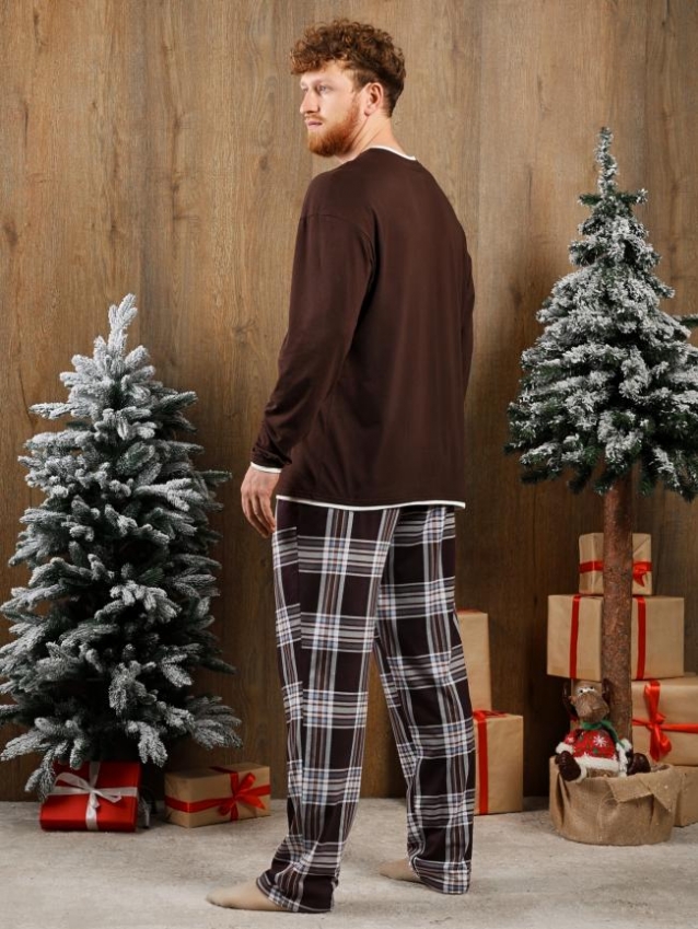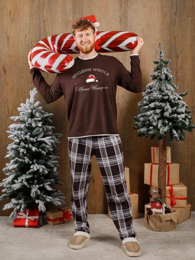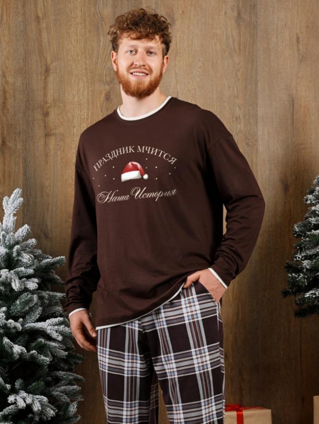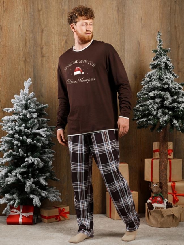 Костюм мужской из трикотажного полотна "кулирка" в комбинации двух видов: гладкокрашенного и с рисунком в крупную клетку, сочетающихся между собой по цвету, состоящий из джемпера и брюк. Джемпер - из гладкокрашеного полотна, свободного покроя, с длинными втачными рукавами и приспущенными плечами, с горловиной овальной формы и тематическим принтом, выполненным в технике шелкографии. Горловина, нижние срезы рукавов и низ изделия обработаны подгибкой с отделочным широким кантом контрастного цвета. Брюки - из полотна в клетку, свободного покроя, прямые, на притачном поясе с эластичной тесьмой внутри, с карманами в боковых швах. Нижние срезы обработаны подгибкой. Комментарии к товару