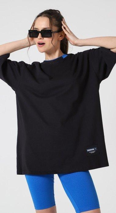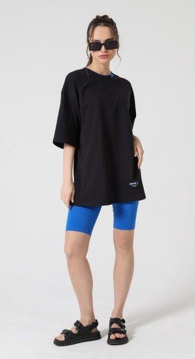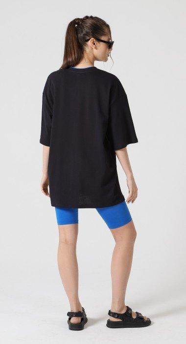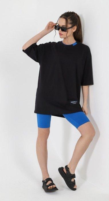 Параметры модели на фото (рост, Ог-От-Об): 169, 83-67-87 Модный и комфортный женский костюм. Футболка черная свободная, удлиненная, со спущенной линией плеч, с яркой нашивкой спереди по низу и оригинальным оформлением горловины. Бриджи однотонные из хлопкового полотна с лайкрой, прилегающего силуэта, длиной выше колен ("велосипедки") Комментарии к товару