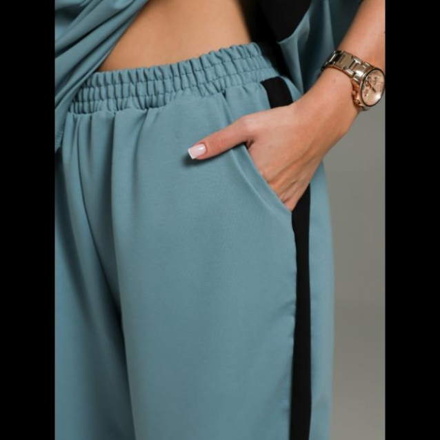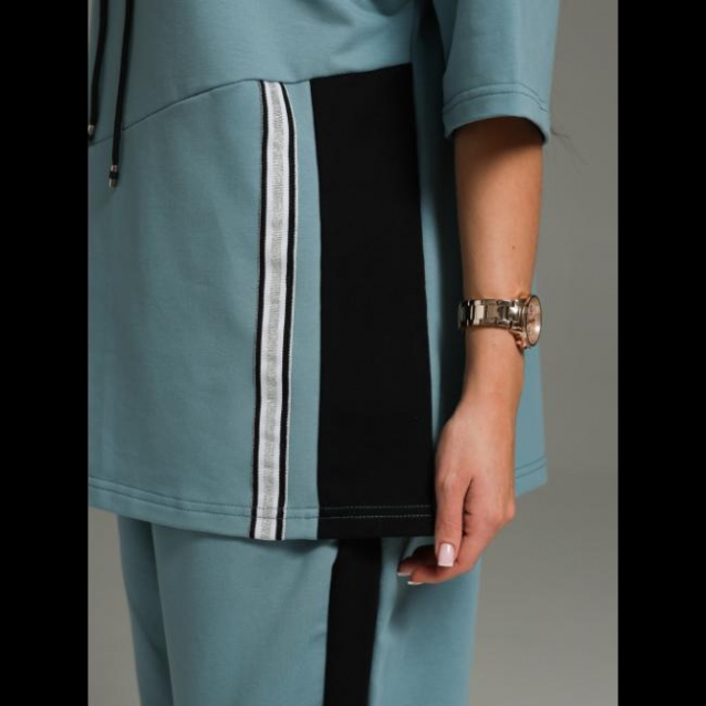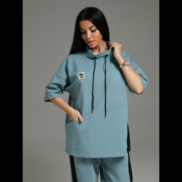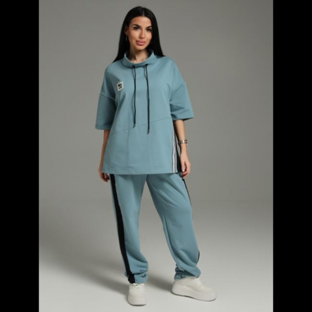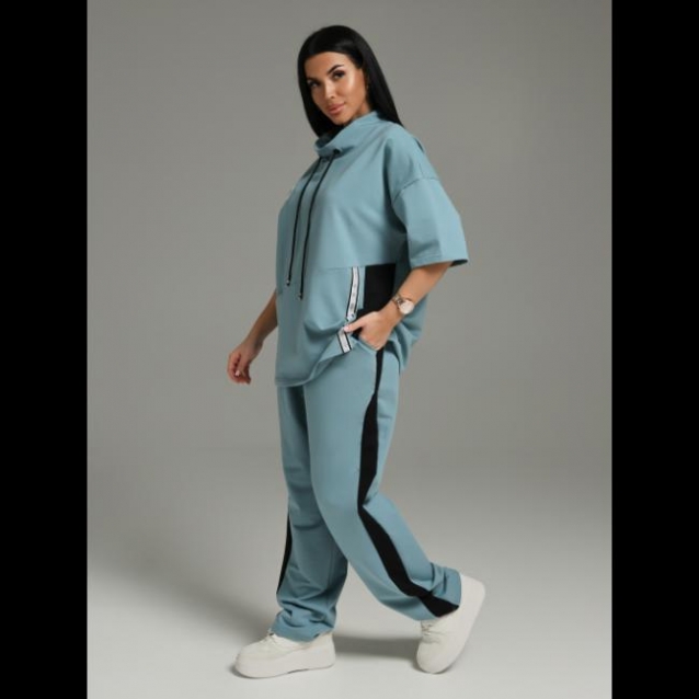 Костюм состоит из кофты и брюк с карманами. Воротник-стойка со шнуровкой-утяжкой. Брюки с лампасами. Оригинальный крой придаст чувство уверенности.