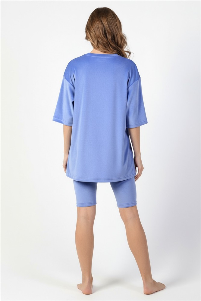 Состав: 95% ПЭ, 5% лайкра Ткань: Велюр стрейч Костюм из гладкокрашеного трикотажного полотна «велюр стрейч», состоящий из футболки и леггинсов. Футболка – удлиненная, свободного покроя, со спущенной, линией плеча, короткими втачными рукавами, горловиной овальной формы, обработанной втачной планкой.Леггинсы – длиной до колен, с эластичной тесьмой по талии.
