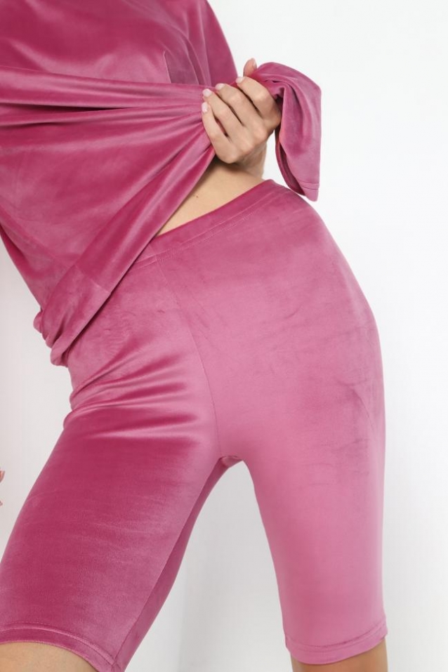 Костюм из гладкокрашеного трикотажного полотна «велюр стрейч», состоящий из футболки и леггинсов. Футболка – удлиненная, свободного покроя, со спущенной, линией плеча, короткими втачными рукавами, горловиной овальной формы, обработанной втачной планкой.Леггинсы – длиной до колен, с эластичной тесьмой по талии. Комментарии к товару