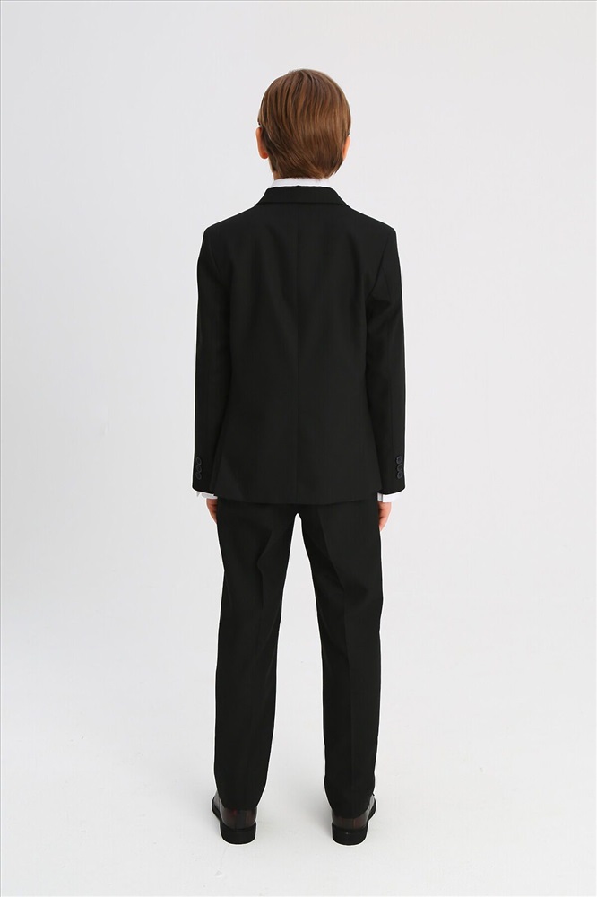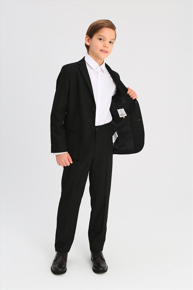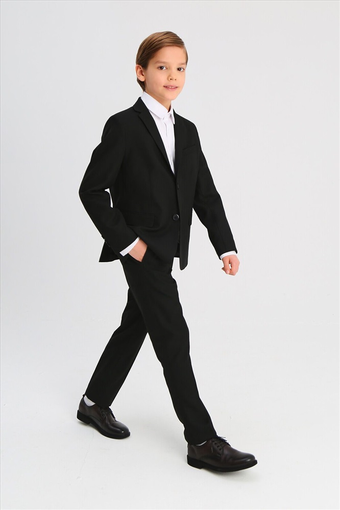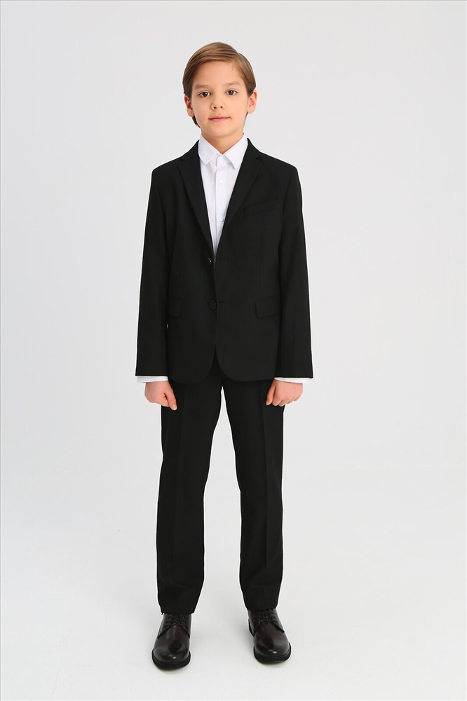 Классический костюм для мальчика из износостойкой и устойчивой к смятию костюмной поливискозы. Пиджак полуприлегающего силуэта с английским воротником, боковыми прорезными карманами с клапаном. Дополнен нагрудным прорезным карманом с листочкой и тремя нарукавными пуговицами. Застёгивается на две пуговицы. Брюки прямого силуэта немного зауженные к низу, со стрелками, боковыми карманами и прорезными задними карманами с клапаном, на втачном поясе с регулировкой и шлёвками.