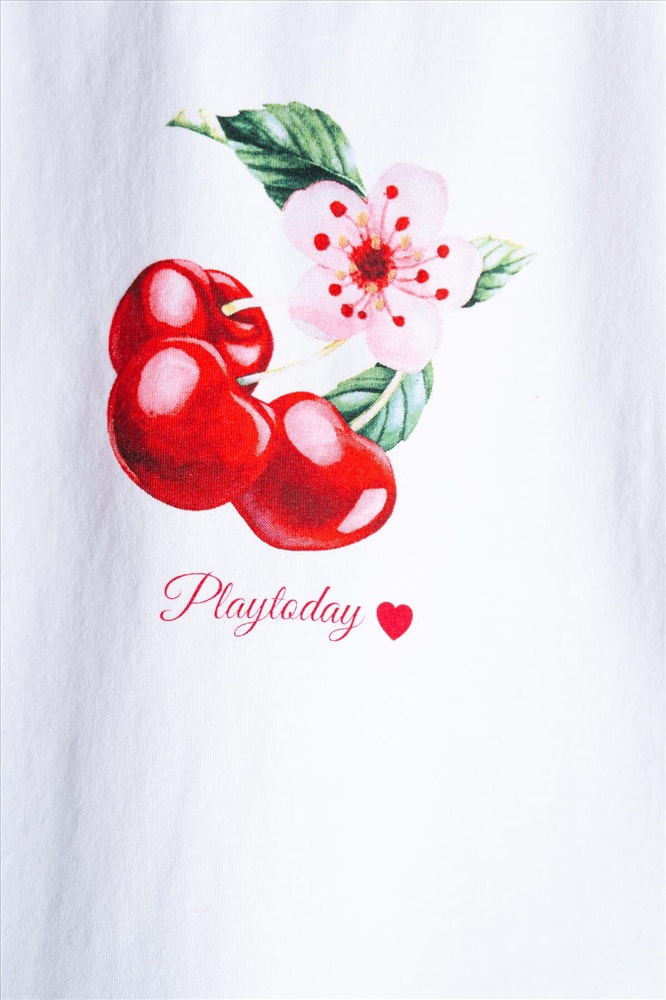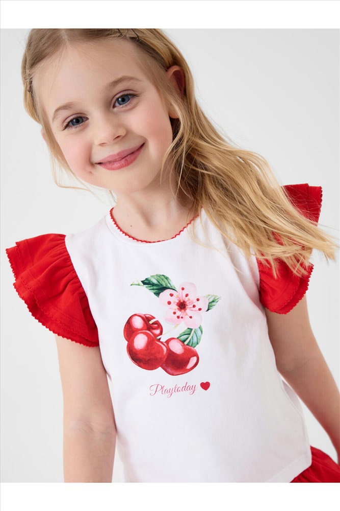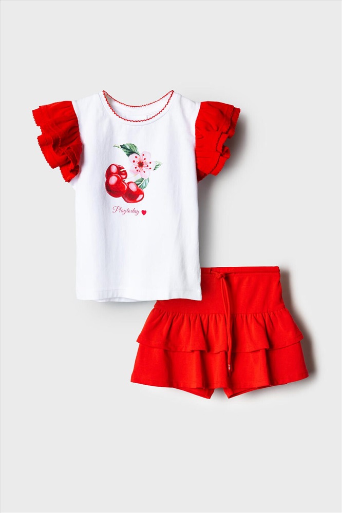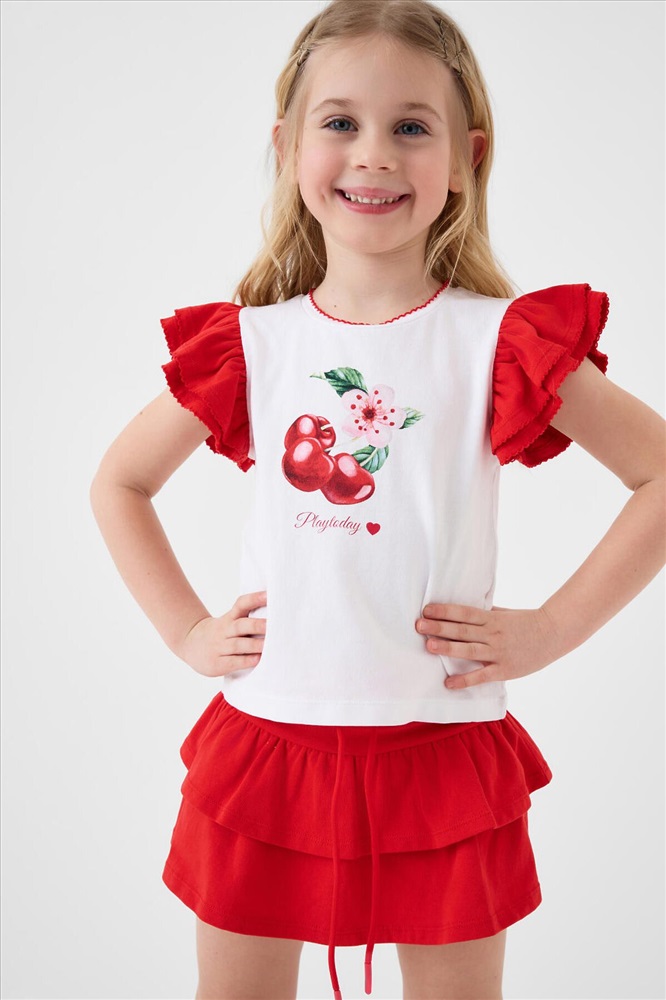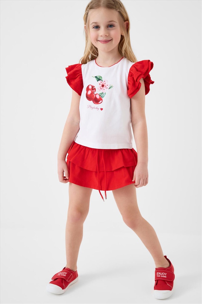 Легкий детский комплект для девочки. Выполнен из мягкого хлопкового трикотажа джерси, состоящий из футболки и юбки-шорт. Футболка прямого кроя с ярким принтом вишен. Рукава-крылышки. Пышная юбка на резинке со шнурком, украшена воланами, внутри имеет удобные шорты, что делает модель практичной для активного отдыха.
