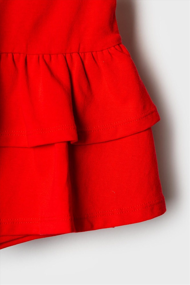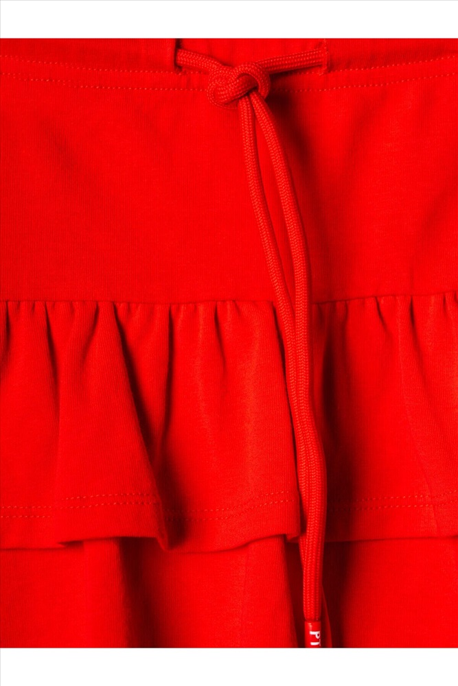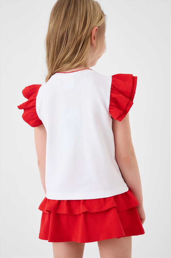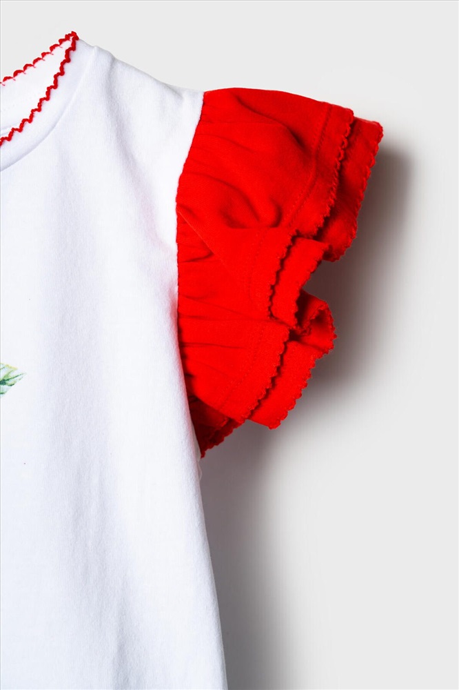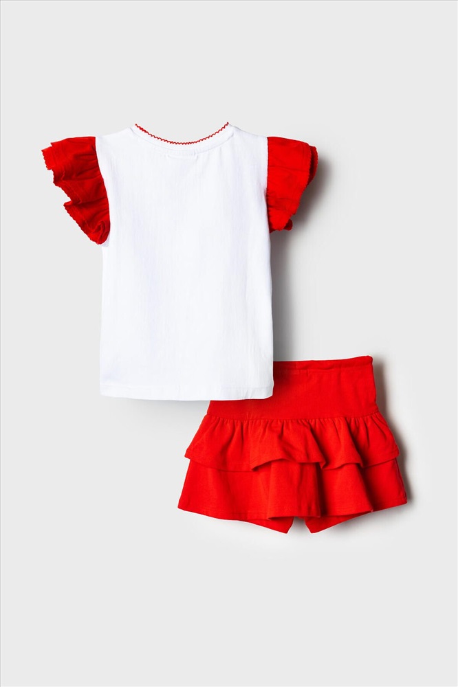 Легкий детский комплект для девочки. Выполнен из мягкого хлопкового трикотажа джерси, состоящий из футболки и юбки-шорт. Футболка прямого кроя с ярким принтом вишен. Рукава-крылышки. Пышная юбка на резинке со шнурком, украшена воланами, внутри имеет удобные шорты, что делает модель практичной для активного отдыха.