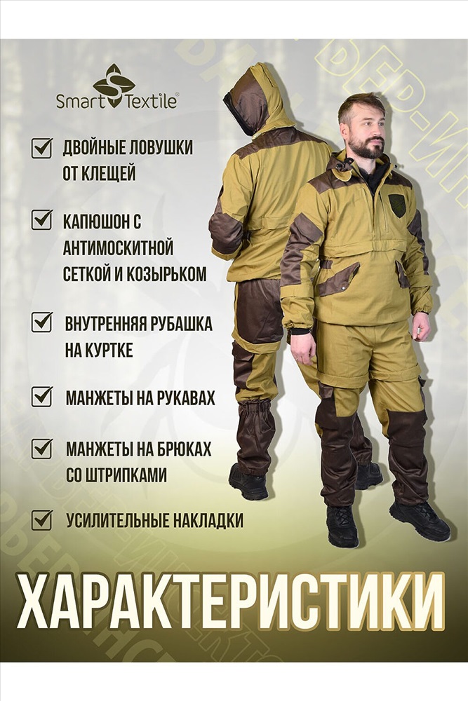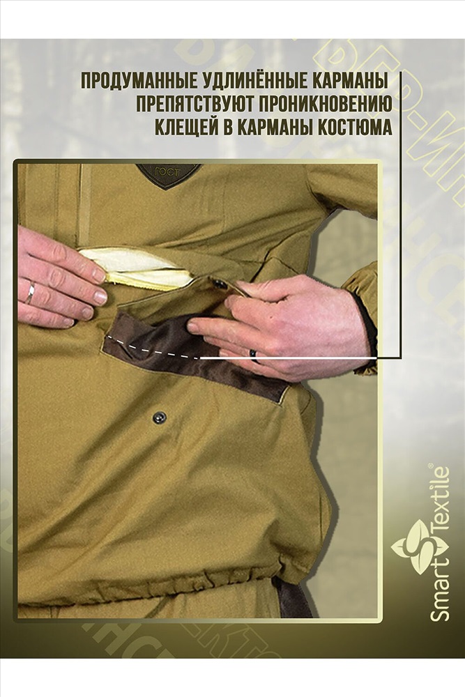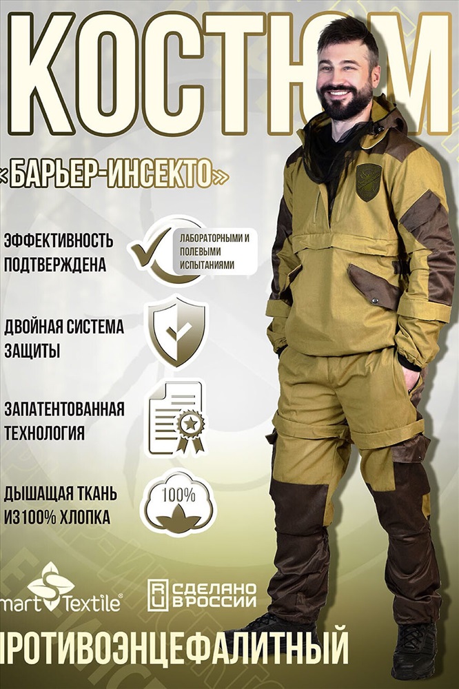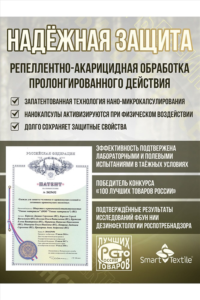 ID товара: 1119035 Состав: 100% Хлопок Сезон: Демисезон Длина: Полная Фасон: Прямой Рукав: длинные Вид застежки: Молния Тип карманов: В шве Декоративные элементы: С капюшоном Стиль: Повседневный Вид ткани: Палаточное полотно Страна бренда: Россия Страна производства: Россия Репеллетентно-аккарицидный костюм Барьер Инсекто это ваш надёжный защитник от клещей и других насекомых в природных условиях! Представляем вам универсальный защитный костюм, выполненный в практичном цвете хаки. Он обеспечивает защиту от клещей и насекомых. Этот костюм станет вашим верным спутником во время активного отдыха, охоты, рыбалки и работы в лесу. Особенности модели: Специальная конструкция с ловушками для клещей на всех элементах. Встроенная антимоскитная сетка для защиты от насекомых. Продуманная система карманов: Куртка: два верхних внутренних кармана на молнии, два нижних внутренних кармана на кнопках, а также внешние карманы на рукавах на липучках. Брюки: два внутренних кармана на молнии и два внешних накладных кармана на кнопках. Технические характеристики: Рост: 170176 см. Размеры: 44/46, 48/50, 52/54, 56/58. Материал верха: плотная ткань палатка (100% хлопок). Защитные элементы: дополнительные защитные элементы на локтях и коленях для дополнительной изноустойчивости. Подкладка: натуральная бязь (100% хлопок). Обработка специальным препаратом на основе технологии нано-микрокапсулирования против клещей на всех ловушках. Преимущества: - Дышащие натуральные материалы. - Продуманный крой для свободы движений. - Надежная защита от клещей и насекомых. - Функциональные карманы для необходимых мелочей. - Комфортная посадка по фигуре. - Костюм от клещей Барьер-Инсекто с микрокапсульной акарицидно-репеллентной обработкой от клещей это надёжная защита от клещевого энцефалита и других инфекций. Он позволяет наслаждаться природой, не беспокоясь о своей безопасности. Основная особенность: Костюм не только имеет физические параметры защиты, но и специальную акарицидно-репеллентную обработку ловушек. Эта обработка оказывает тройное действие на насекомых: - Отпугивающее предотвращает посадку летающих насекомых и приближение ползающих. - Дезориентирующее при попадании насекомого на ловушку, оно теряет ориентацию в пространстве и не может вонзить свой хоботок. - Летальное гибель насекомого наступает через 510 минут. Где носить: - Костюм будет полезен в различных ситуациях: - Во время охоты или сбора грибов в лесу. - На рыбалке в заболоченной местности. - При работе в саду и огороде. - Во время туристических походов. - При проведении полевых работ. Сделайте свой отдых безопасным и комфортным с противоэнцефалитным костюмом Барьер Инсекто! Костюм прошел лабораторные и полевые испытания в тайге. Комментарии к товару