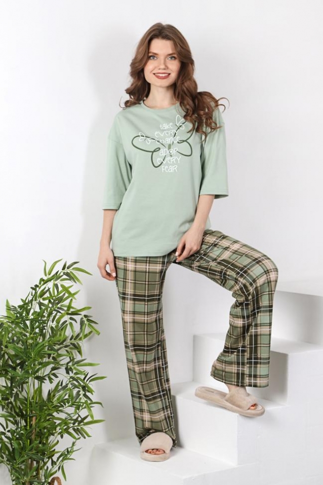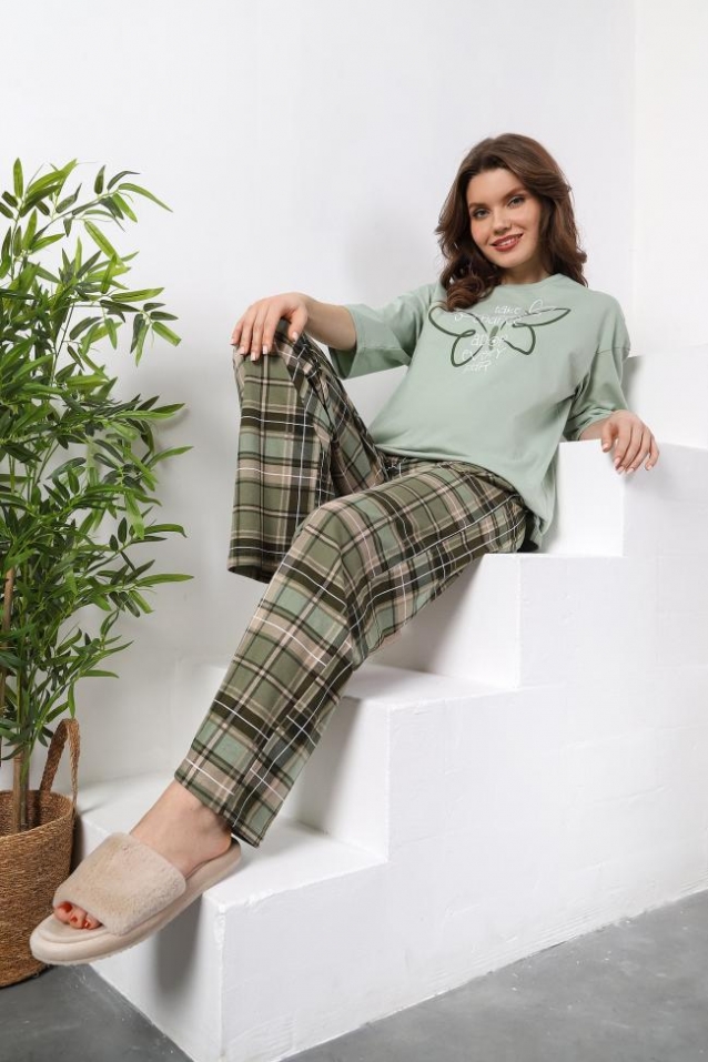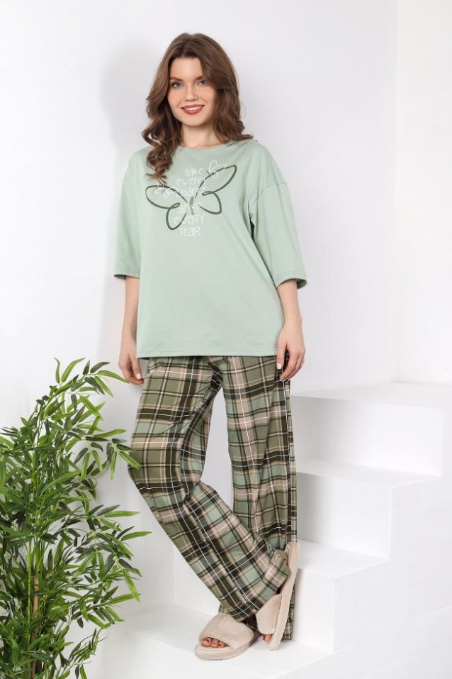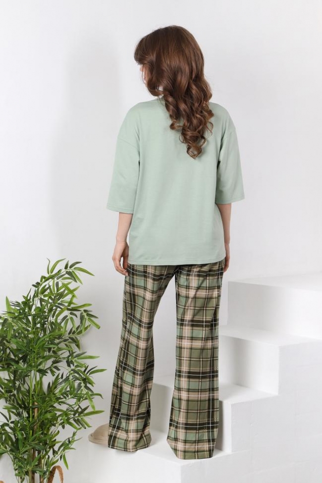 Костюм молодежный из трикотажного полотна «кулирка» в комбинации двух видов: с набивным рисунком и гладкокрашеного в единой цветовой гамме, состоящий из футболки и брюк. Футболка - из гладкокрашеного полотна, классического покроя, с короткими втачными рукавами, горловиной овальной формы и принтом на полочке, выполненным в технике «шелкографии». Горловина обработана притачной бейкой из основного материала.Брюки - из полотна с набивным рисунком, длинные, слегка расширенные книзу, с карманами в боковых швах, на притачном поясе с эластичной тесьмой внутри. Комментарии к товару
