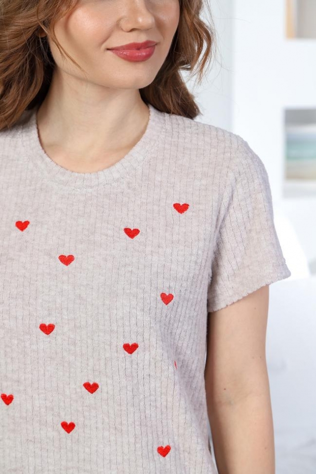 Костюм молодежный из гладкокрашенного трикотажного махрового полотна, Футболка – классического покроя, с короткими втачными рукавами и горловиной овальной формы, обработанной втачной планкой, с вышивкой на полочке. Шорты - средней длины, свободные, с эластичной тесьмой по талии.