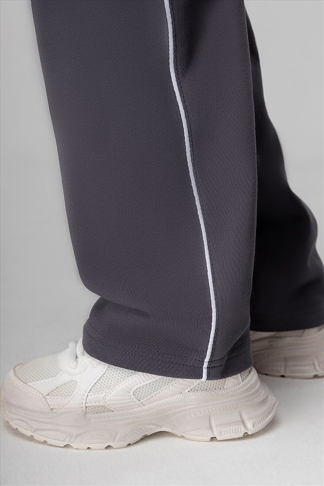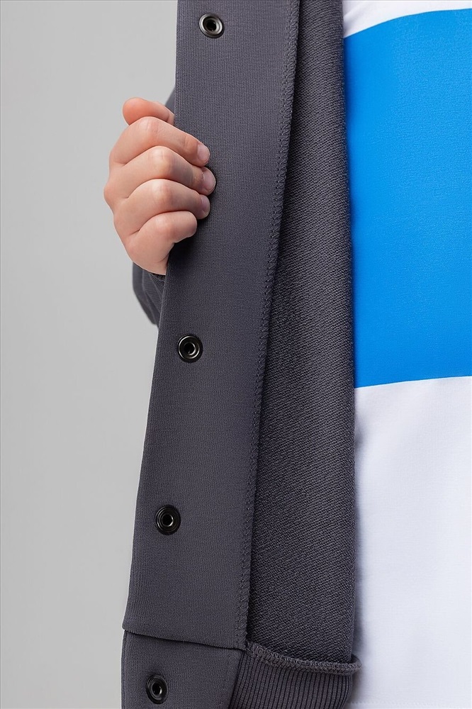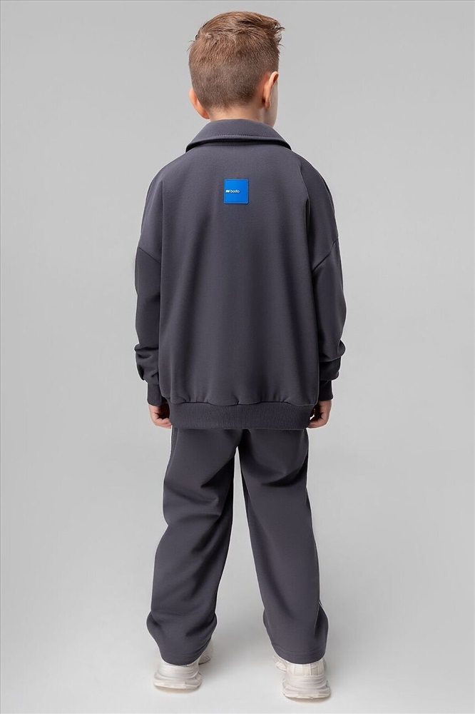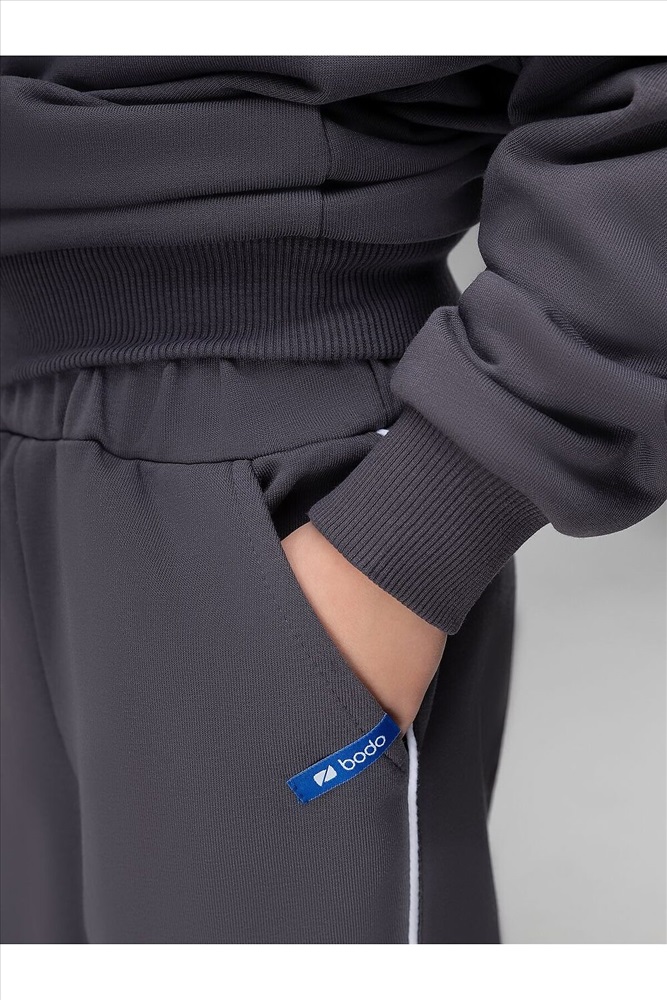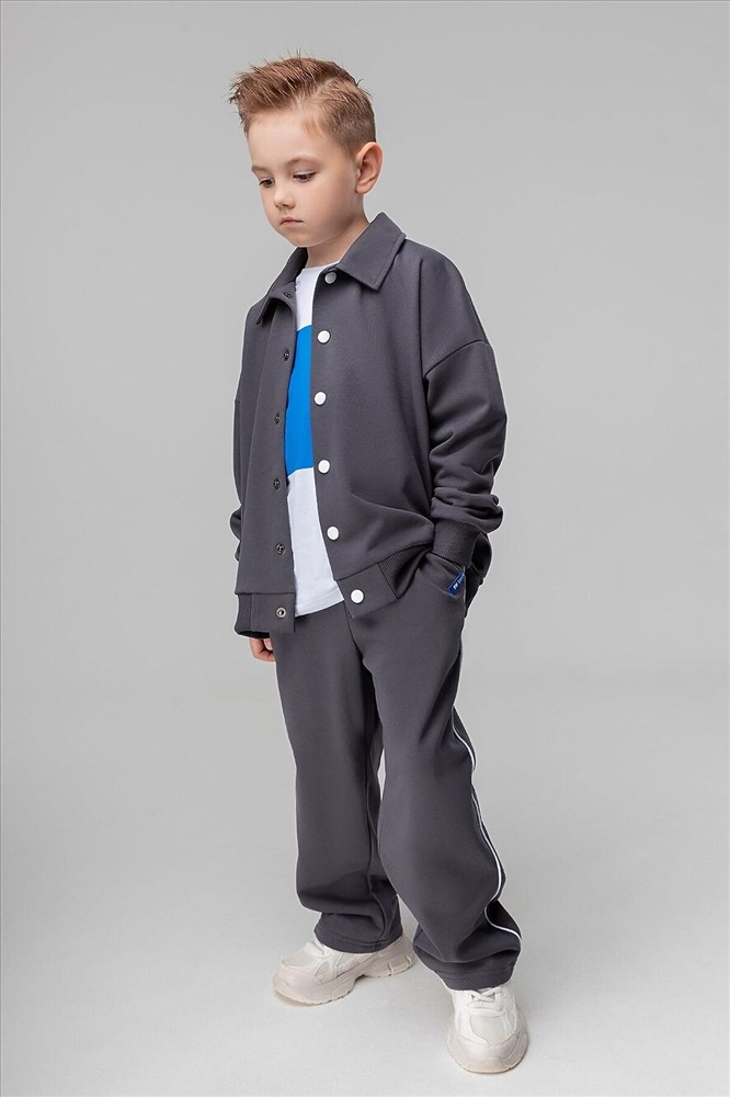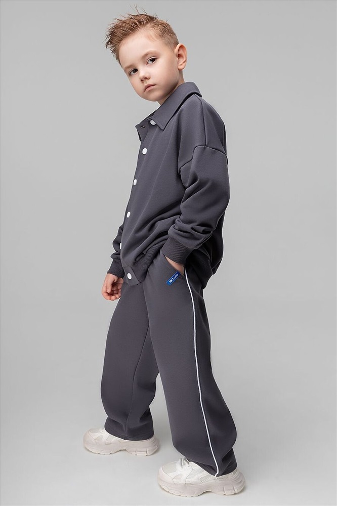 Костюм: толстовка и брюки. Свободная толстовка прямого силуэта на кнопках, с длинным рукавом с манжетой. Толстовка с отложным воротником. Толстовка с поясом по низу изделия. Брюки прямые свободные на поясе с внутренней резинкой. С боковыми карманами. Брюки оформлены атласным кантом по боковым швам.