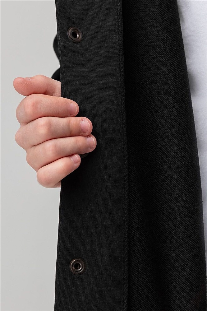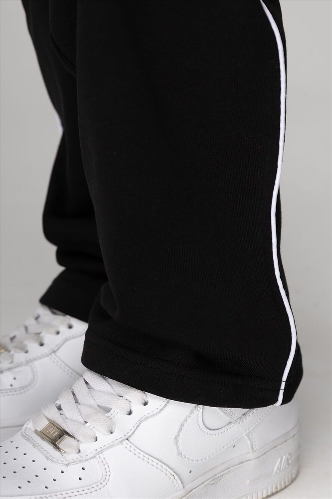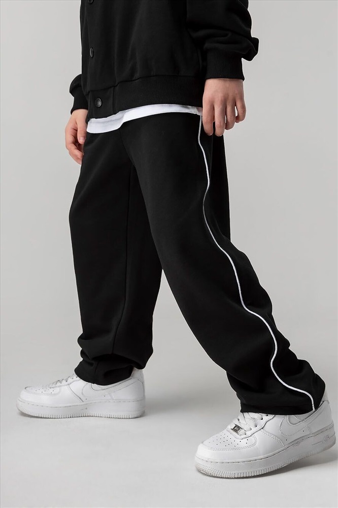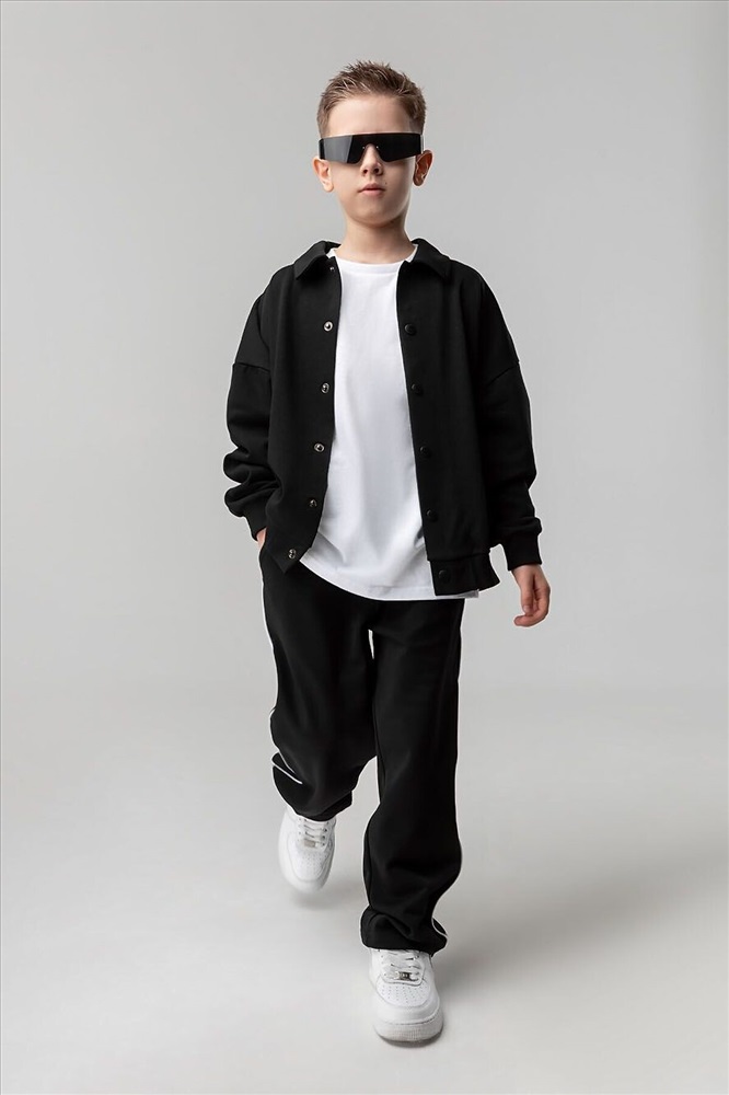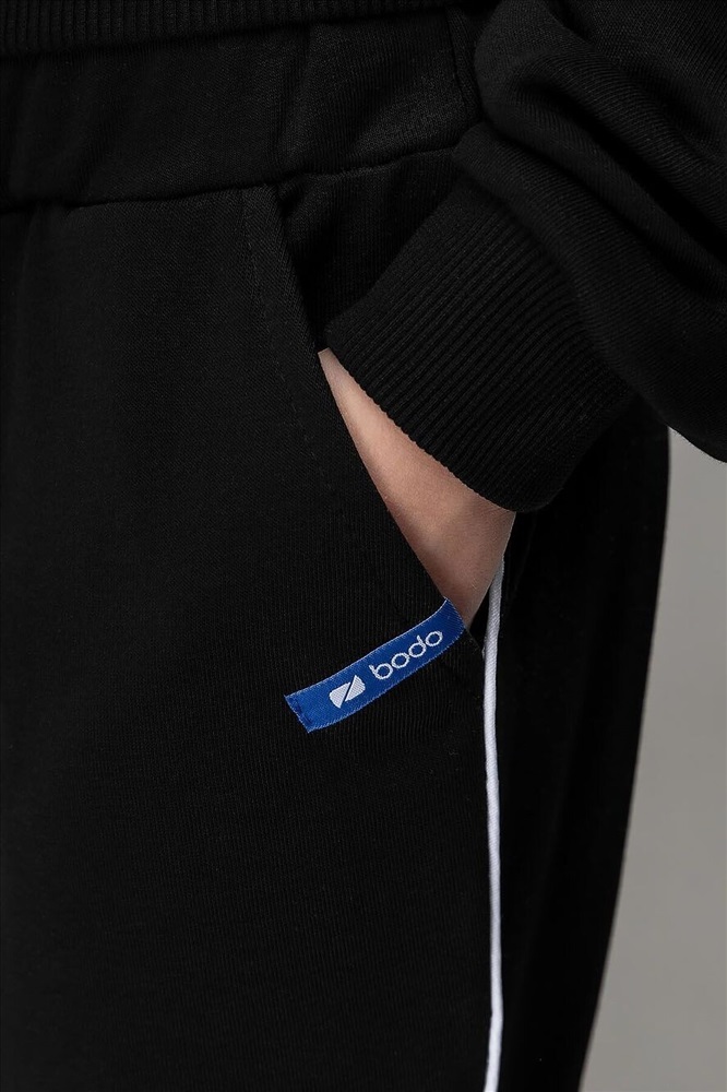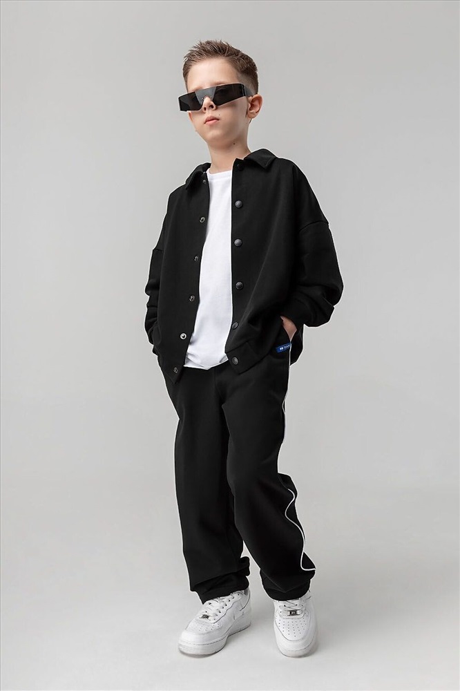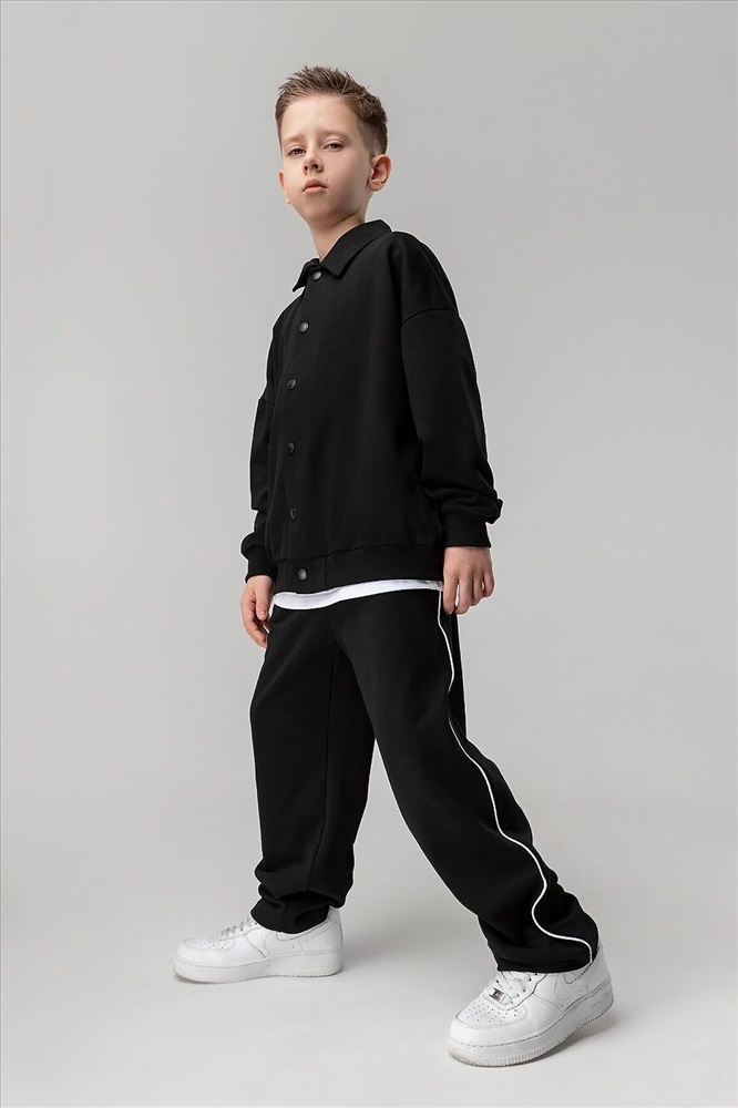 Костюм: толстовка и брюки. Свободная толстовка прямого силуэта на кнопках, с длинным рукавом с манжетой. Толстовка с отложным воротником. Толстовка с поясом по низу изделия. Брюки прямые свободные на поясе с внутренней резинкой. С боковыми карманами. Брюки оформлены атласным кантом по боковым швам.