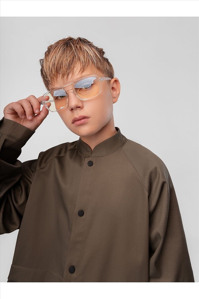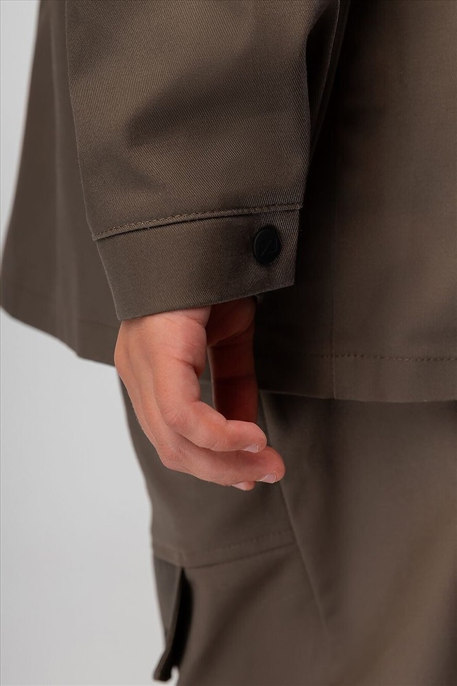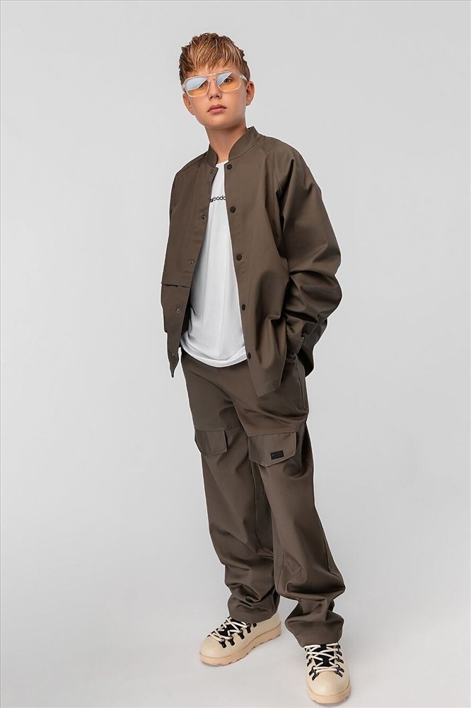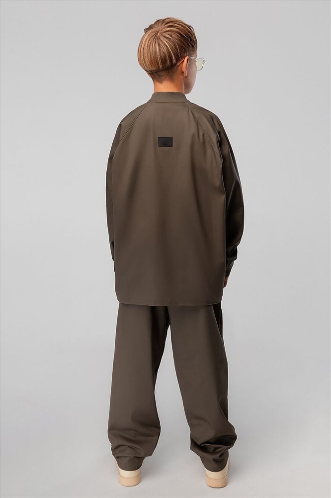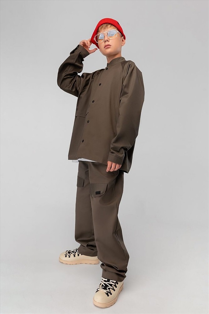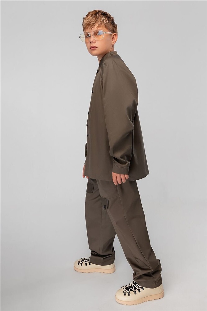 Костюм: рубашка и брюки. Свободная рубашка на кнопках, воротник стойка, правая полочка со складкой. Низ изделия прямой. Свободные брюки, расширенные в бёдрах, низ изделия прямой. Брюки с боковыми карманами. На передних половинках декоративные клапаны, на поясе шлёвки. Плотность саржевого переплетения 240 гр.