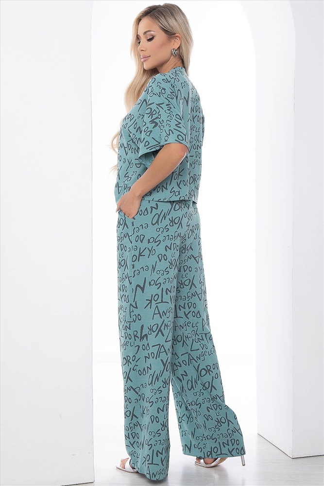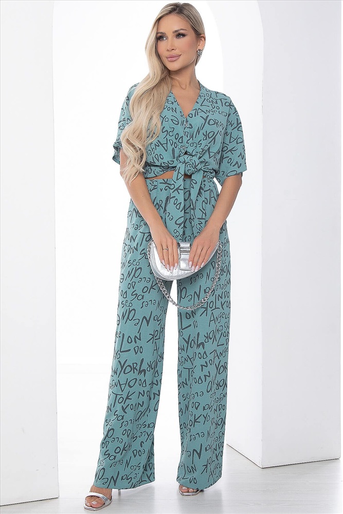 ID товара: 989483 Состав: 83% Полиэстер, 12% Вискоза, 5% Эластан Сезон: Весна/Лето Длина: Полная Фасон: Свободный Рукав: короткие Вид застежки: Пуговицы Крой брючин: Широкий Рисунок: Абстракция Тип карманов: С отрезным бочком Декоративные элементы: Завязки Основная ткань: Полиэстер Стиль: повседневный Страна бренда: Россия Страна производства: Россия Артикул: К9079. Ткань: Сингапур. Состав: 83% п/э, 12% вискоза, 5% эластан. Цвет: мятный. Вид застежки: пуговицы на рубашке. Силуэт: свободный. Карманы: есть. Длина верха по спинке: 44/ 51 см, 46/ 52 см, 48/ 53 см, 50/ 54 см, 52/ 55 см, 54/ 56 см. Длина брюк с учетом резинки: 44/ 101 см, 46/ 106 см, 48/ 106 см, 50/ 107 см, 52/ 107 см, 54/ 107 см. Рост модели: 168 см. Костюм из лёгкой ткани, состоящий из свободной рубашки и брюк, идеально подойдёт для летнего расслабленного образа. Свободный крой не сковывает движений и дарит комфорт. Карманы в боковых швах у брюк. Рубашка застёгивается на пуговицы. Уход за изделием: бережная стирка до 30 градусов; нельзя отбеливать; деликатный отжим; гладить при t не более 110 С; гладить с изнанки. *Допуск отклонения длины при массовом производстве 1-3 см является нормой. Комментарии к товару