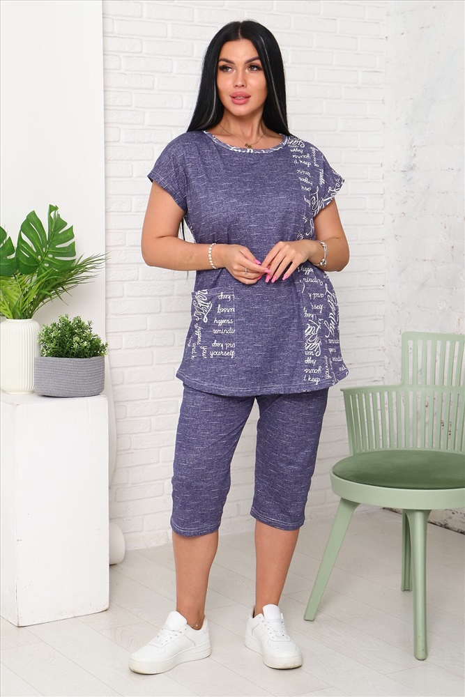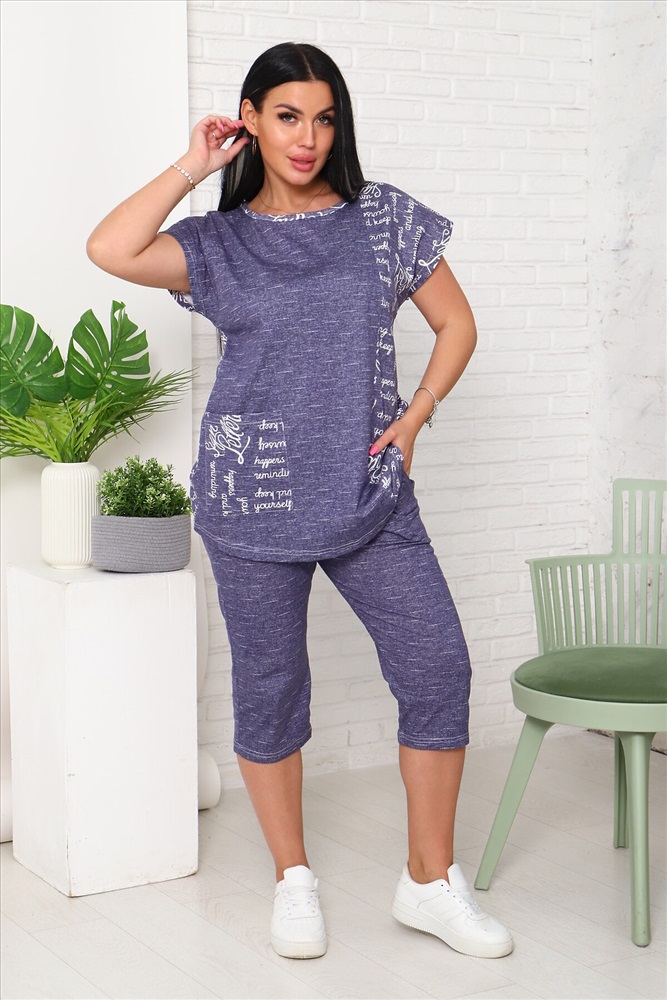 ID товара: 1184021 Состав: 100% Хлопок Сезон: Весна/Лето Длина: Средняя Фасон: Полуприлегающий Рукав: короткие Крой брючин: Прямой Рисунок: Надпись Тип карманов: С отрезным бочком Декоративные элементы: Принт Основная ткань: Хлопок Стиль: повседневный Вид ткани: Кулирка Страна бренда: Россия Страна производства: Россия Костюм женский футболка и бриджи. Футболка со спущенным плечом и накладным карманом, низ футболки фигурный. Бриджи с карманами. Комментарии к товару