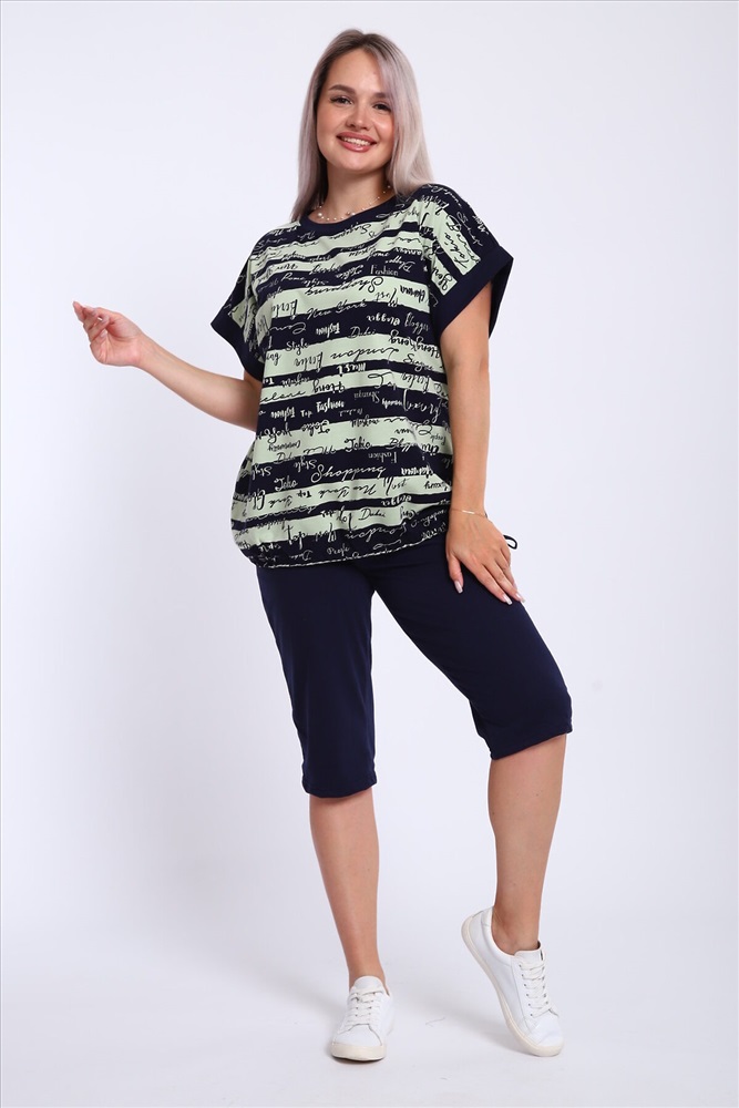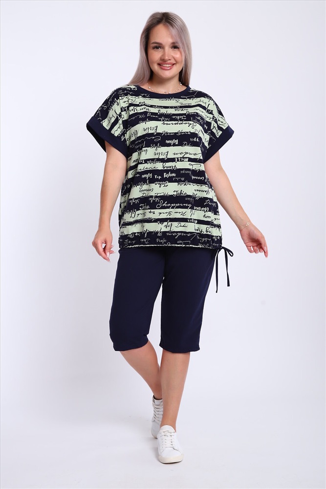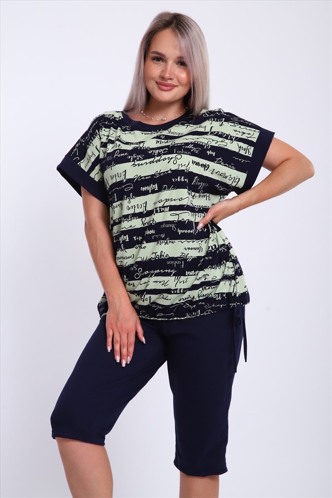 ID товара: 1184017 Состав: 100% Хлопок Сезон: Весна/Лето Длина: Средняя Фасон: Свободный крой Рукав: короткие Крой брючин: Прямой Рисунок: Надпись Декоративные элементы: Принт Основная ткань: Хлопок Стиль: Повседневный Вид ткани: Кулирка Страна бренда: Россия Страна производства: Россия Костюм женский футболка и бриджи .Футболка свободного кроя, плечо спущенное на манжете. Низ футболки собирается на шнурок .Бриджи на резинке, без карманов. Комментарии к товару