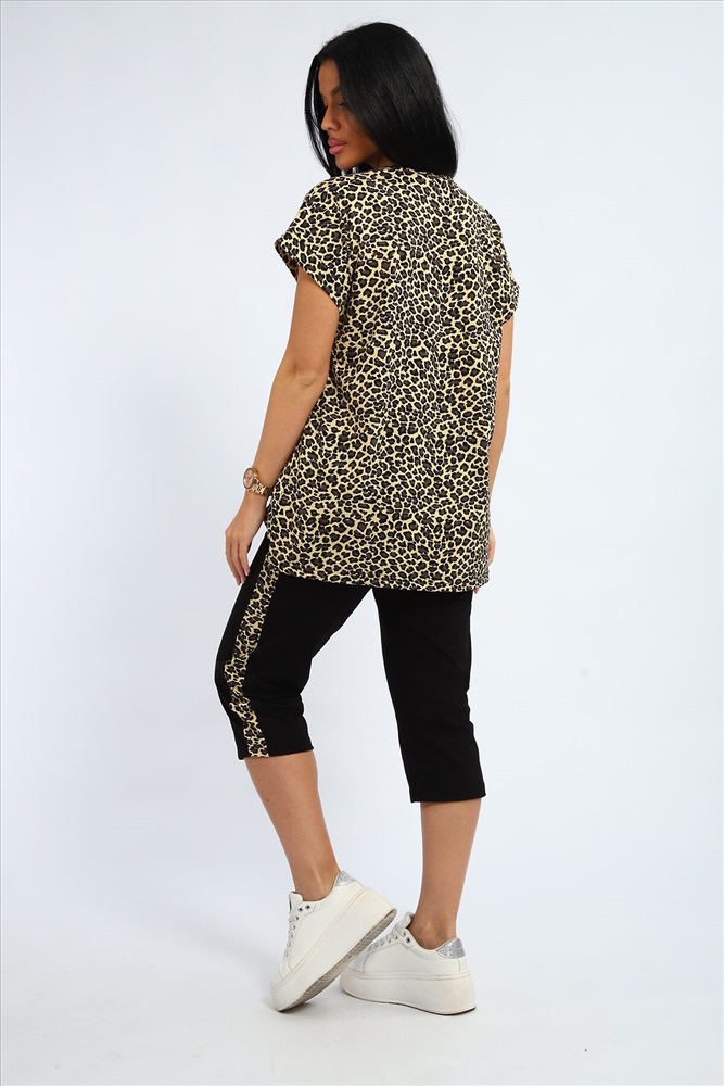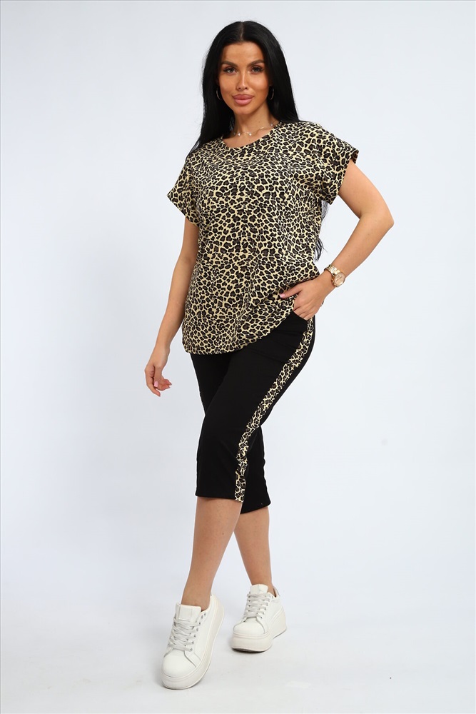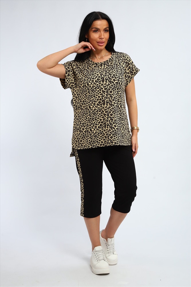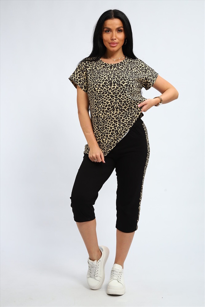 ID товара: 1218217 Состав: 100% Хлопок Сезон: Демисезон Длина: Средняя Фасон: Полуприлегающий Рукав: короткие Крой брючин: Прямой Рисунок: леопардовый Декоративные элементы: Принт Основная ткань: Хлопок Стиль: повседневный Вид ткани: Кулирка Страна бренда: Россия Страна производства: Россия Костюм женский футболка и бриджи. Футболка полуприлегающего силуэта, плечо спущенное, разрезы в боковых швах. Бриджи с карманами и лампасами. Комментарии к товару