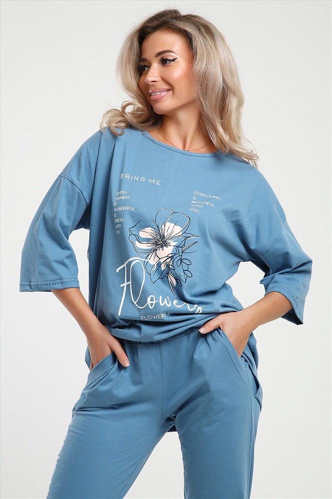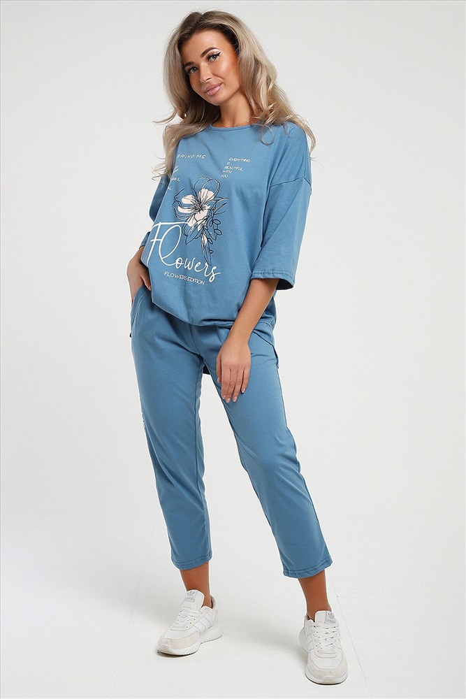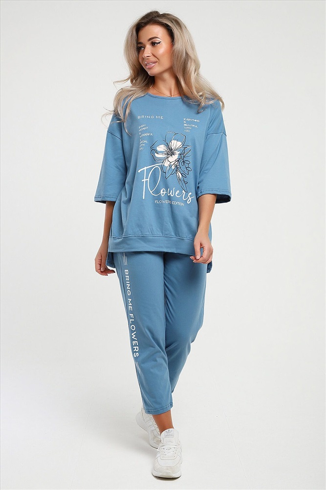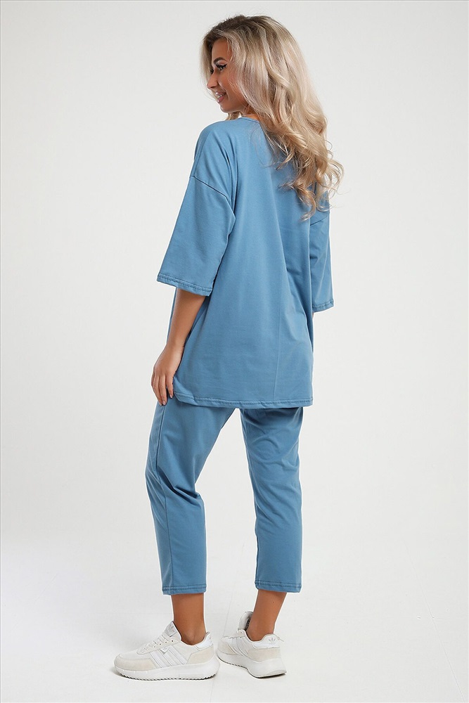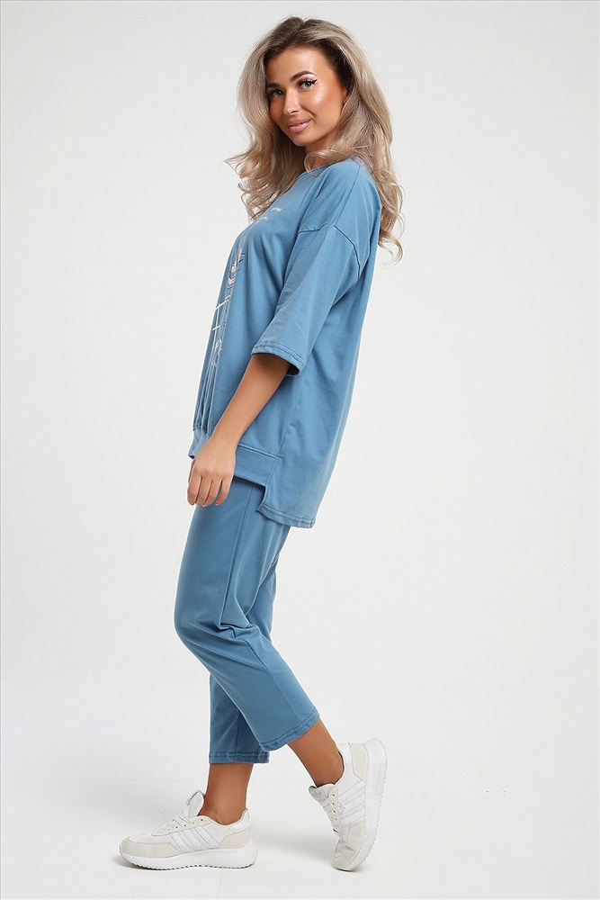 ID товара: 1099409 Состав: 100% Хлопок Сезон: Весна/Лето Длина: Средняя Фасон: Свободный Рукав: 3/4 Крой брючин: Прямой Рисунок: Надпись Тип карманов: В шве Декоративные элементы: Принт Основная ткань: Хлопок Стиль: повседневный Вид ткани: Кулирка Страна бренда: Россия Страна производства: Россия Костюм футболка с капри. Покрой оверсайз. Футболка с удлиненной спинкой. На полочке красивый принт. Капри удлиненные с карманами. Комментарии к товару