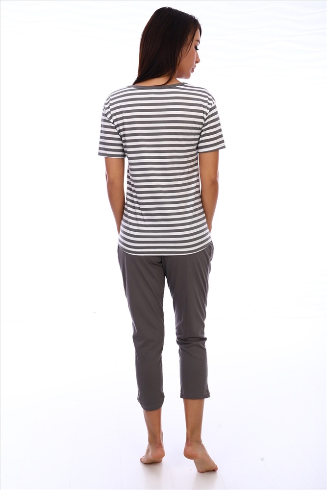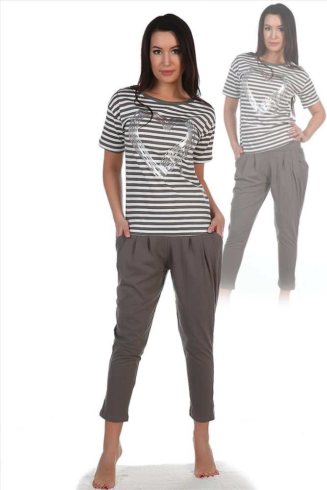 Костюм из кулирки футболка + бриджи. Полосатая футболка с принтом в виде серебристого сердца. Однотонные бриджи с карманами, длина чуть выше щиколоток