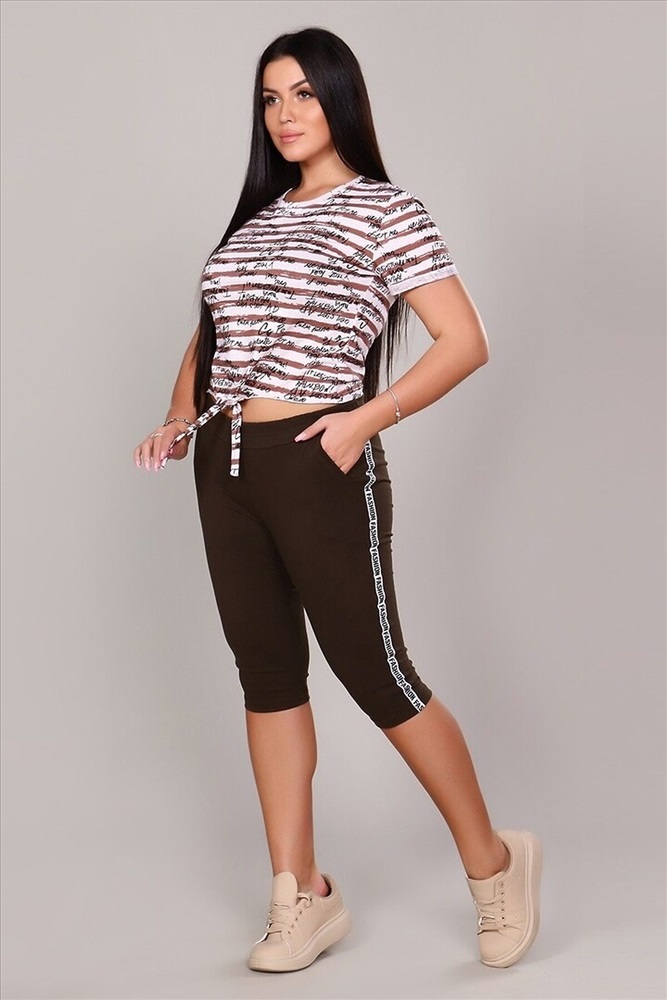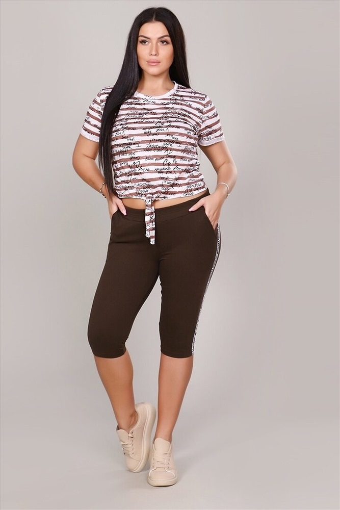 ID товара: 1112264 Состав: Хлопок 100% Сезон: Весна/Лето Длина: Средняя Фасон: Полуприлегающий Рукав: короткие Крой брючин: Облегающий Рисунок: Полоски Тип карманов: С отрезным бочком Декоративные элементы: Принт Основная ткань: Хлопок Стиль: повседневный Вид ткани: Кулирка Страна бренда: Россия Страна производства: Россия Этот костюм действительно универсален! Он отлично подойдет для различных активностей, будь то пробежка, занятия домашними делами или прогулка с детьми. Кулирная гладь из хлопка обеспечивает комфорт и воздухопроницаемость, что особенно важно во время физической активности или прогуливаясь в жаркую погоду. Укороченная футболка с декоративным узлом добавляет стиль и оригинальность, а бриджи с карманами и эластичным поясом обеспечивают свободу движений и практичность. Такой комплект станет отличным выбором для активного образа жизни! Размер 44: футболка: длина:50 см; ширина:46 см. бриджи: длина внеш.шва:62 см; длина внут.шва:41 см;ширина по бедрам:47 см. Размер 46: футболка: длина:50 см; ширина:48 см. бриджи: длина внеш.шва:62 см; длина внут.шва:41 см;ширина по бедрам :47 см. Размер 48: футболка: длина:54 см; ширина:51 см. бриджи: длина внеш.шва:63 см; длина внут.шва:41 см;ширина по бедрам :48 см. Размер 50: футболка: длина:54 см; ширина:51 см. бриджи: длина внеш.шва:63 см; длина внут.шва:41 см; ширина по бедрам:48 см. Размер 52: футболка: длина:56 см; ширина:53 см. бриджи: длина внеш.шва:62 см; длина внут.шва:41 см; ширина по бедрам:48 см. Размер 54: футболка: длина:56 см; ширина:55 см. бриджи: длина внеш.шва:62 см; длина внут.шва:41 см; ширина по бедрам:49 см. Комментарии к товару