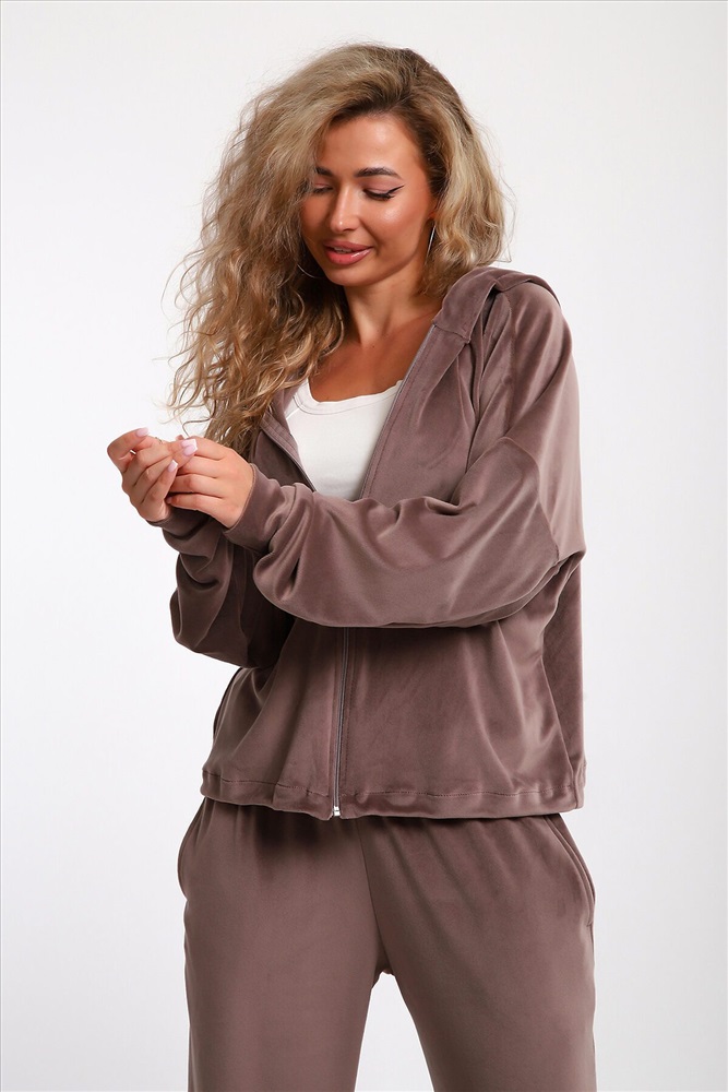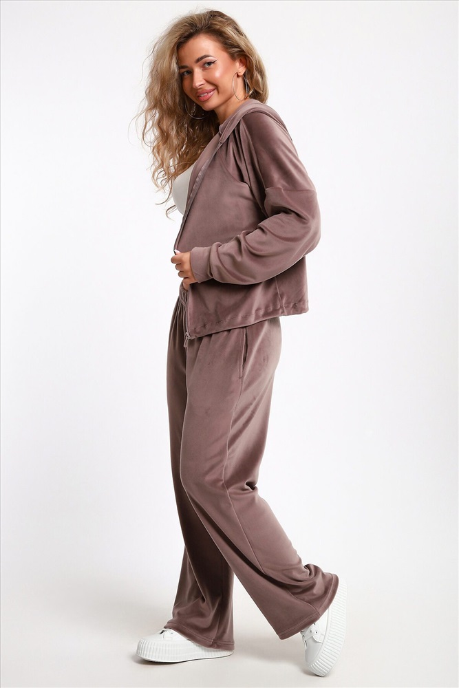 Костюм женский велюровый состоит из толстовки на молнии и брюк. Толстовка с глубоким капюшоном, по низу утягивающий шнур с фиксаторами, рукав спущенный с манжетом, брюки прямые с карманами. Костюм мягкий, удобный, отлично подойдет для дома, прогулок и отдыха.