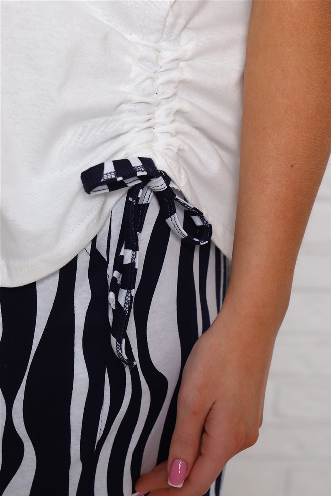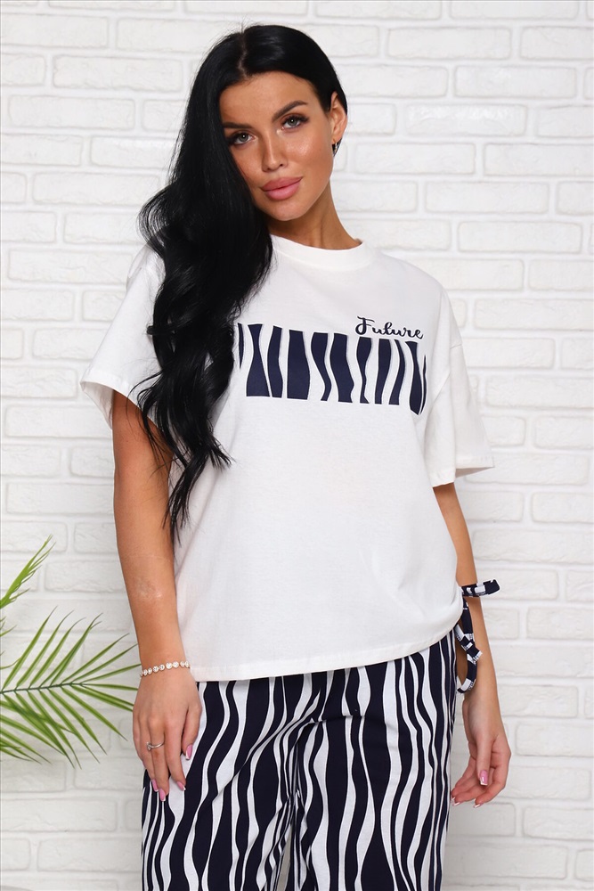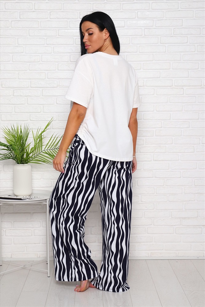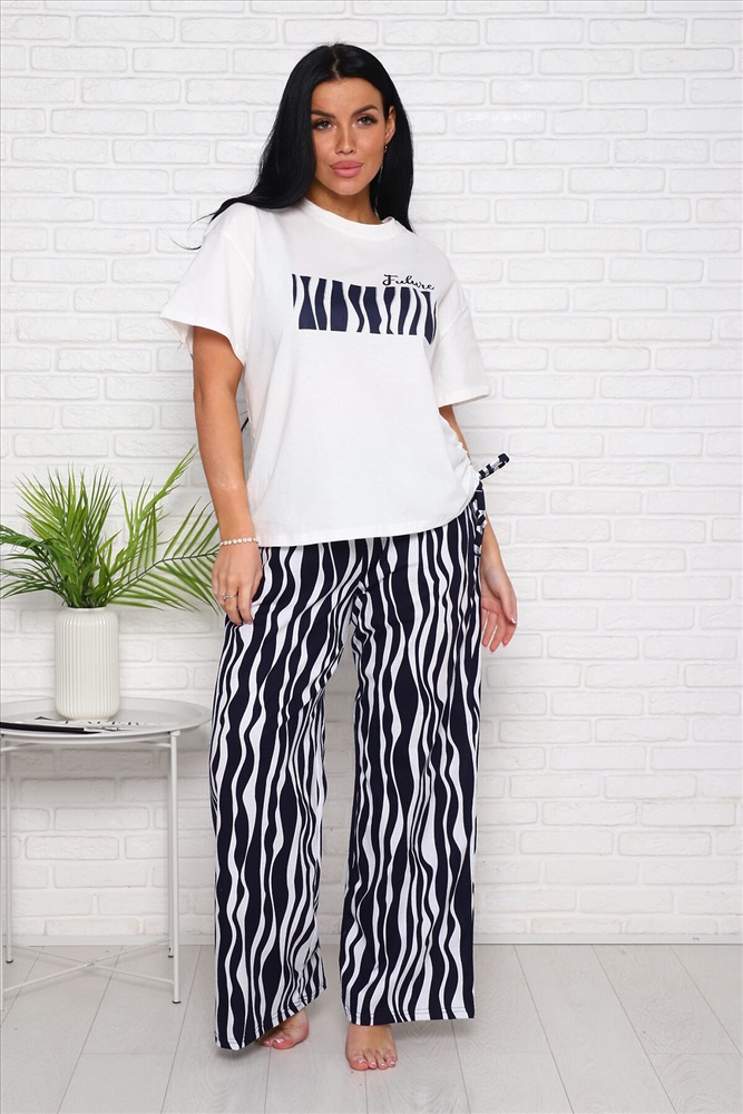 ID товара: 978409 Состав: 100% Хлопок Сезон: Весна/Лето Длина: Полная Фасон: Свободный Рукав: Короткие Крой брючин: Широкий Рисунок: Абстракция Тип карманов: В шве Декоративные элементы: Принт Основная ткань: Хлопок Стиль: повседневный Вид ткани: Кулирка Страна бренда: Россия Страна производства: Россия Женский костюм выполнен из трикотажного полотна кулирка. Костюм состоит из футболки и брюк. Футболка свободного силуэта по горловине выполнена обтачка, на полочке пресутсвуют печать, сбоку кулиска. Брюки расклёшенного силуэта по бокам карманы. Комментарии к товару