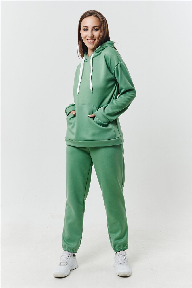 Стильный женский костюм состоит из худи с капюшоном и карманом кенгуру, удобные брюки внизу собраны на резинку в виде манжета. Поможет Вам быть в тренде этого сезона! Костюм из мягкой толстовки со спущенным рукавом и брюками прекрасно подойдет для вечерних и повседневных образов, для прогулок и занятий спортом, а также в качестве костюма для дома. Брюки из футера очень удобны в качестве повседневной одежды, не сковывают движения. Костюм двойка выполнен из трикотажа на меху, не теряет форму после многочисленных стирок, не скатывается. Костюм идеально походит для носки в осенне-зимнее время года.