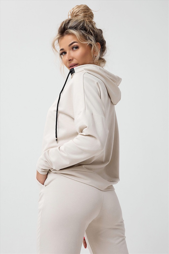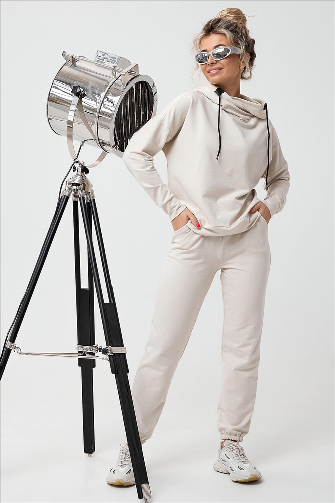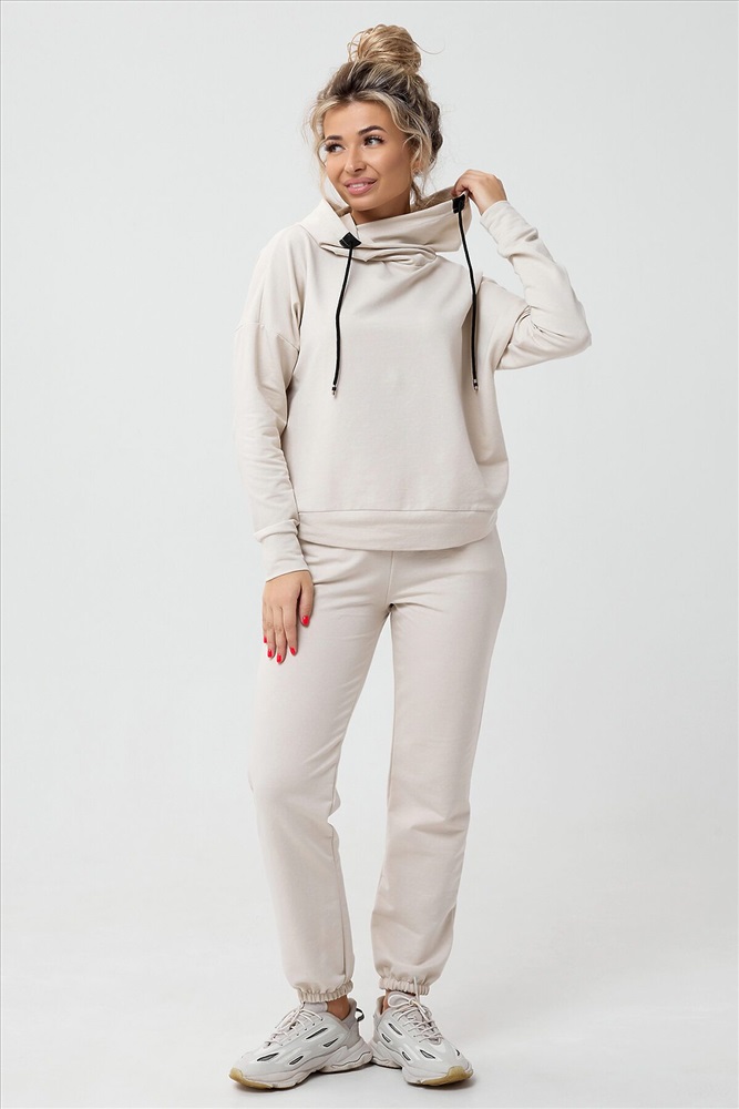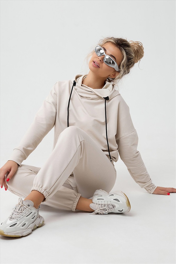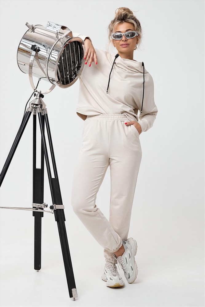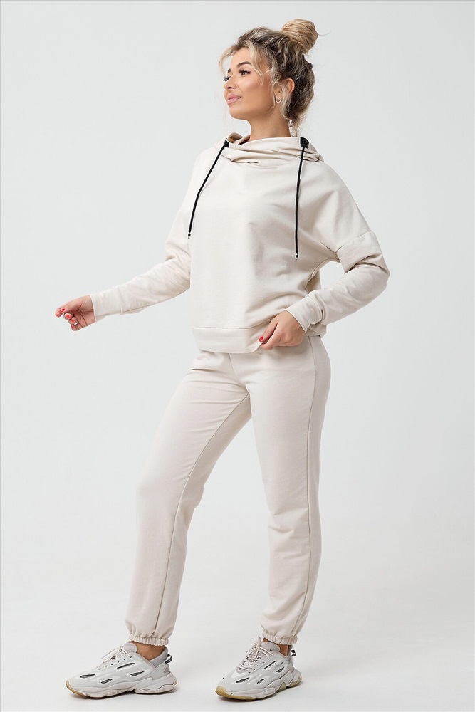 Молодежный костюм из футера 2-х нитки. Худи с длинным рукавом и с капюшоном. Брюки - джоггеры с резинкой на ногах, по бокам внутренние карманы, пояс на резинке. Очень стильный и необычный капюшон.