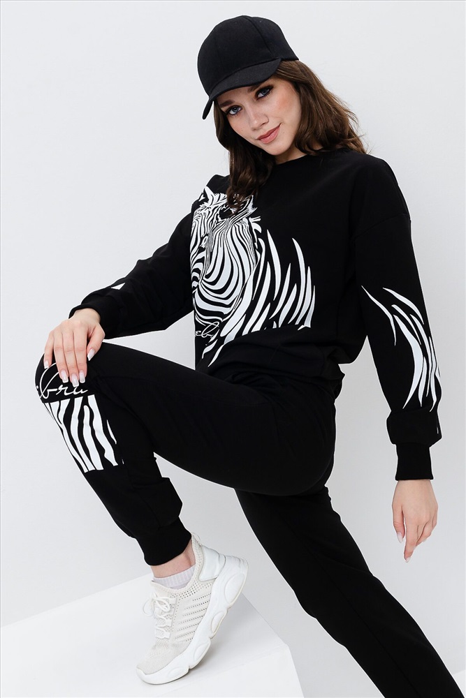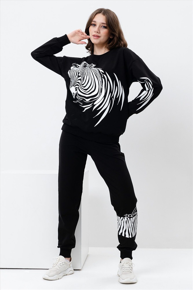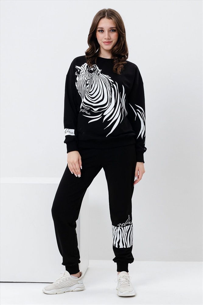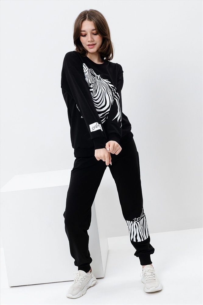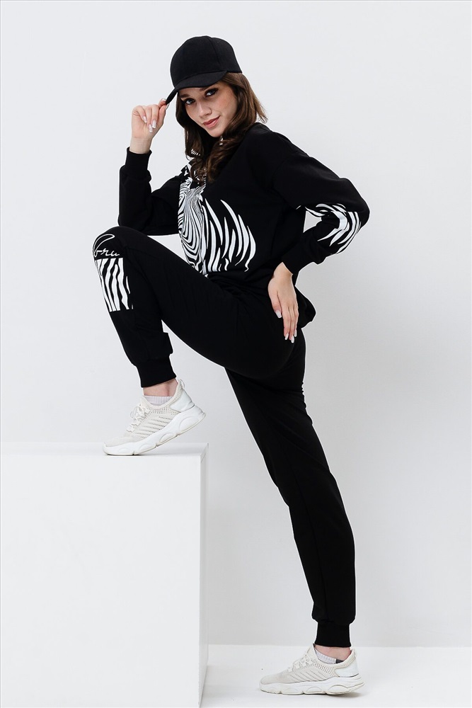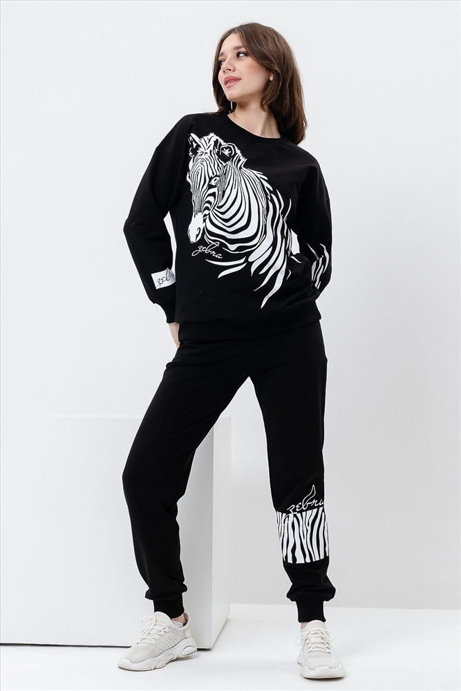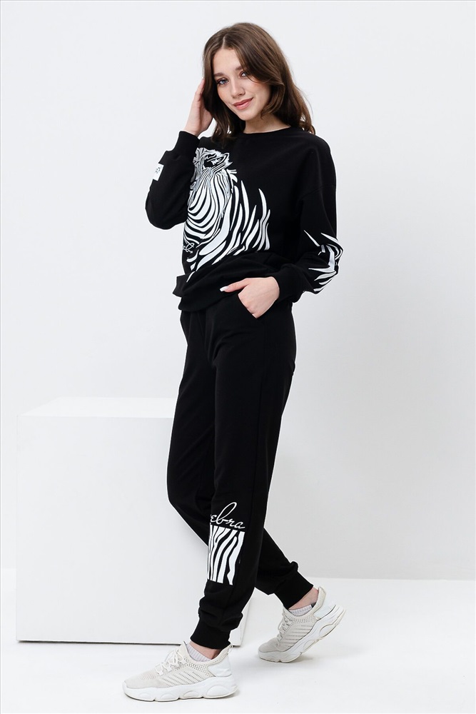 ID товара: 907572 Состав: Хлопок 72%, Полиэстер 23%, Лайкра 5% Сезон: Весна/Лето Длина: Средняя Фасон: Свободный крой Рукав: длинные Крой брючин: Зауженный Рисунок: зебра Основная ткань: Хлопок Стиль: Повседневный Вид ткани: Футер с лайкрой 2-х нитка Страна бренда: Россия Страна производства: Россия Женский костюм с брюками и толстовкой. Материал футер 2-х нитка с лайкрой. По все длине брюк и толстовки печать. Толстовка с манжетами, по низу брюк резинка. Комментарии к товару