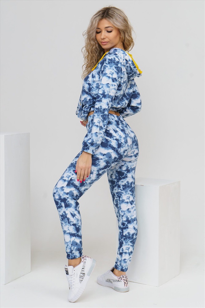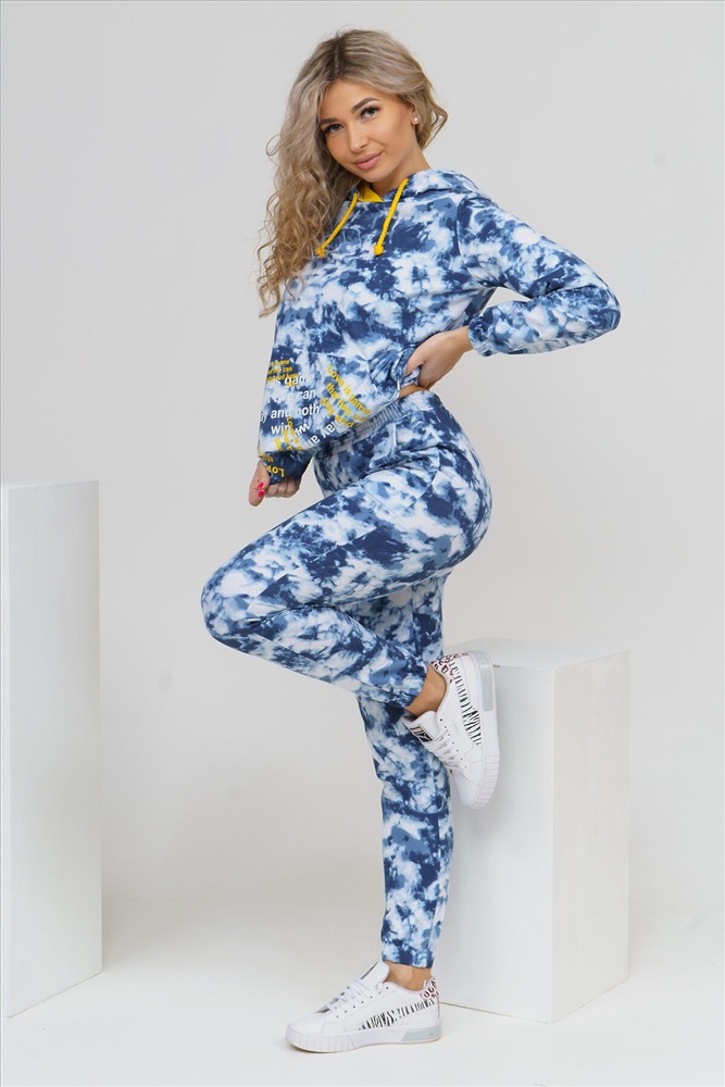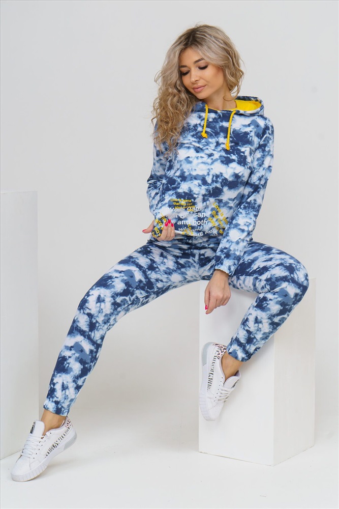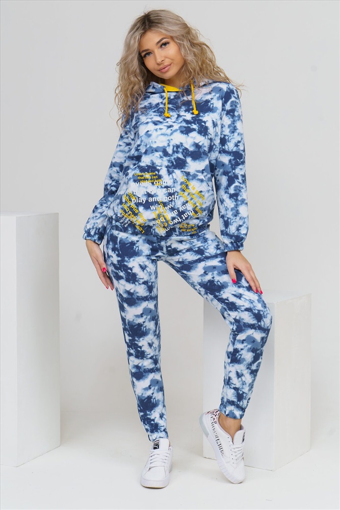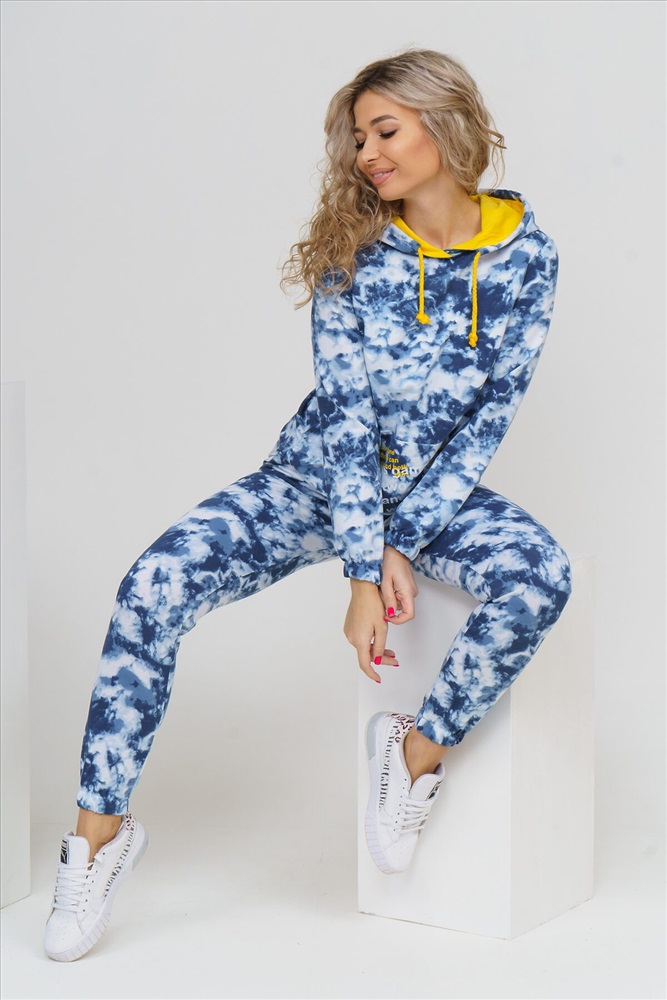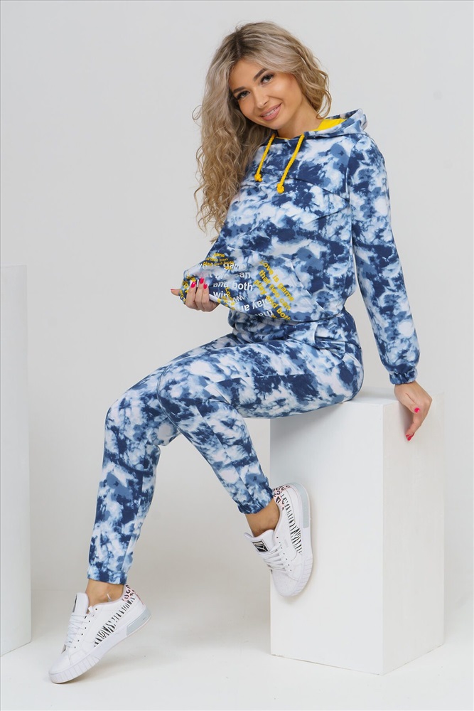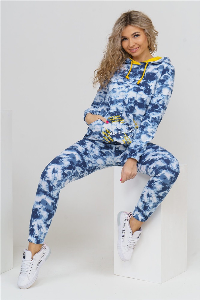 Яркий стильный костюм с дизайном тай-дай и принтом в виде надписи состоит из толстовки и брюк. Толстовка с капюшоном и жёлтой вставкой внутри сочетается с надписью на кармане кенгуру и шнурком. Низ толстовки и рукава на резинке. Брюки с карманами и резинкой на талии и по низу. Тай-дай без сомнения получил титул самого популярного принта сезона. Этот, как его часто называют психоделический узор, в миг заполнил хроники стритстайла и инстаграм модниц.